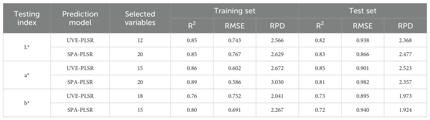 The combination of nondestructive testing technology and feature variable extraction methods (such as UVE and SPA) can effectively improve the accuracy of machine learning models to predict the fruit quality (Li et al., 2020; Gao et al., 2025; Hu et al., 2019). The feature variables with the best predictive ability can be selected after processing using the feature variable extraction method, which reduces the model complexity and information overlap, and improves the prediction accuracy and stability of the model (Meng et al., 2025). combined hyperspectral imaging with various algorithmic models, such as UVE, SPA, and PLSR, to nondestructively test the soluble solid content of multi-species blueberries, finding that the UVE-PLSR prediction model had the highest accuracy (Che et al., 2024). combined near-infrared spectroscopy with UVE and SPA to extract effective wavelengths, and the results showed that the model established by PLSR predicted the hardness and SSC of fragrant pear better (Tang et al., 2024). predicted SSC and hardness of fragrant pear based on dielectric spectroscopy technology and machine learning models, and found that compared with the SVR and PSO-LSSVR models, the PLSR model had the highest accuracy (Tian et al., 2024). used PLSR and random forest algorithms to establish quantitative prediction models for SSC and random forest based on the bulk optical properties of apples, and indicated that the PLSR models were optimal for quantitative prediction of SSC and fruit firmness. This study also shows that the colour prediction of fragrant pear established by UVE- PLSR and SPA- PLSR was better, which suggests that the PLSR is more effective for establishing fruit quality prediction models. It may be that PLSR model can effectively deal with the problem of covariance and construct a stable prediction model even if the independent variables are highly correlated with each other.