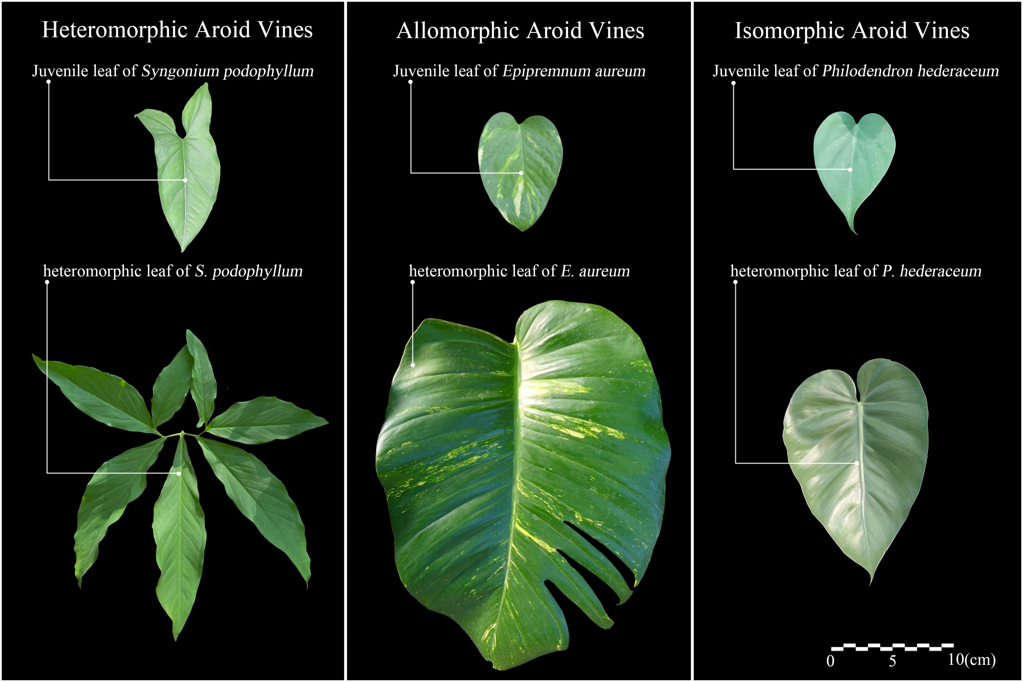 Aroid vines exhibit various life forms, including isomorphic, allomorphic, and heteromorphic types, with the characteristic of heterophylly. Their leaf morphology can adjust with climbing height, and they also demonstrate differences between climbing and creeping stems, as well as underground roots and aerial roots. These plants show varying resource allocation strategies at different growth stages. Future research should delve deeper into the environmental signaling pathways, exploring how light, humidity, contact, and CO2 concentration affect morphological development and the relationship between climbing height and plant longevity. Models of growth and hormone regulation networks should be established to explore how different hormones influence these morphological changes, facilitating the rapid formation of mature forms for landscaping applications.