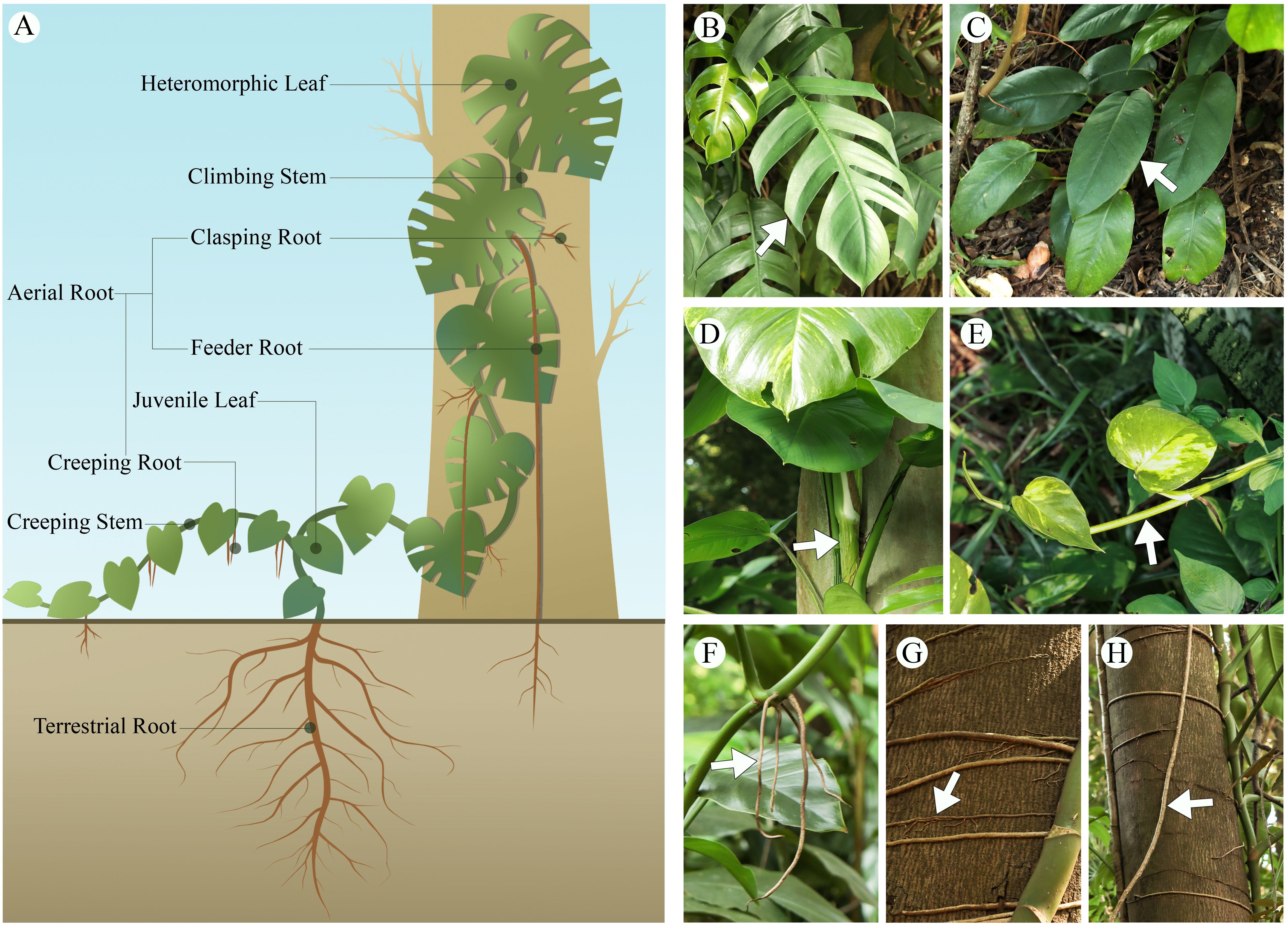Figure 2. Morphological adaptations of aroid vines in growth. (A) illustrative diagram of aroid vines growth. (B) heteromorphic leaf of Epipremnum pinnatum, (C) Juvenile leaf of E. pinnatum, (D) climbing stem of Epipremnum aureum, (E) creeping stem of E. aureum, (F) creeping root of Rhaphidophora megaphylla, (G) clasping root of R. megaphylla, (H) feeder root of R. megaphylla.