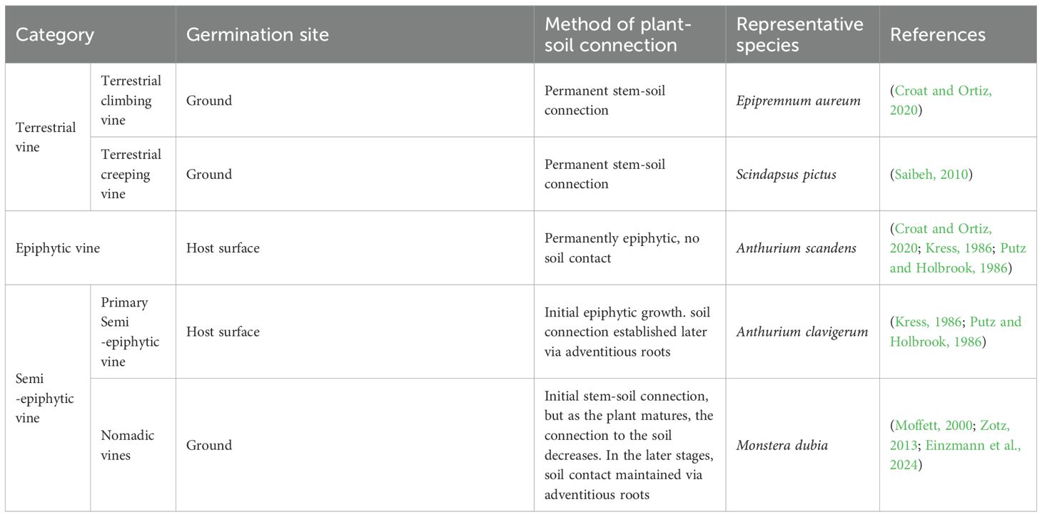 Aroid vines can be categorized based on their life form (Table 1), including terrestrial, epiphytic, and semi-epiphytic types. Terrestrial vine can be divided into terrestrial climbing and terrestrial creeping types. Most aroid vines exhibit a terrestrial climbing habit, although some species possess weak climbing abilities and primarily grow prostrate, representing the terrestrial creeping type. Examples include certain species of Scindapsus and Philodendron (Saibeh, 2010; Vasconcelos et al., 2018). Kress and Putz categorized semi-epiphytic plants into “primary semi-epiphytic” and “secondary semi-epiphytic” plants (Kress, 1986; Putz and Holbrook, 1986), with the latter still lacking empirical support. Moffett and Zotz proposed the term “nomadic vines” to replace “secondary semi-epiphytic” plants (Moffett, 2000; Zotz, 2013). In field studies, few species clearly fit the semi-epiphytic classification, particularly those classified as nomadic vines, as such categories often do not align with their in situ life histories, suggesting the need for further data on the classification of aroid vines’ life forms (Einzmann et al., 2024).