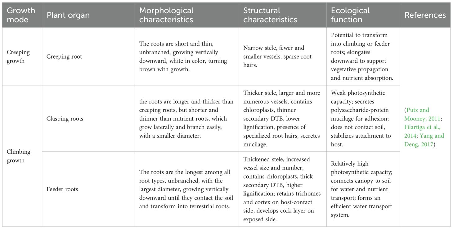 Studies have shown that feeder roots grow downward to reconnect with the soil, possessing larger vessel diameters and a thickened suberized double thickened band layer, which confer greater hydraulic efficiency and water retention capacity compared with other root types (Filartiga et al., 2014). In contrast, clasping roots grow laterally, and their development typically proceeds through three distinct stages: first, aerial roots emerge at the node; then, the root cap secretes mucilage to assist initial adhesion upon contact with the support; and finally, the roots elongate and develop root hairs, adjusting their morphology according to the host surface texture, secreting a polysaccharide-protein composite gel to enhance adhesion. For instance, Syngonium podophyllum produces roots in a specific pattern, with rapid root growth in the early stage, followed by slower growth after root formation. The strength of adhesion increases over time. In addition, Syngonium possesses unique spirally-splitting root hairs that enhance adhesion, and their formation is influenced by external mechanical forces (Yang and Deng, 2017).