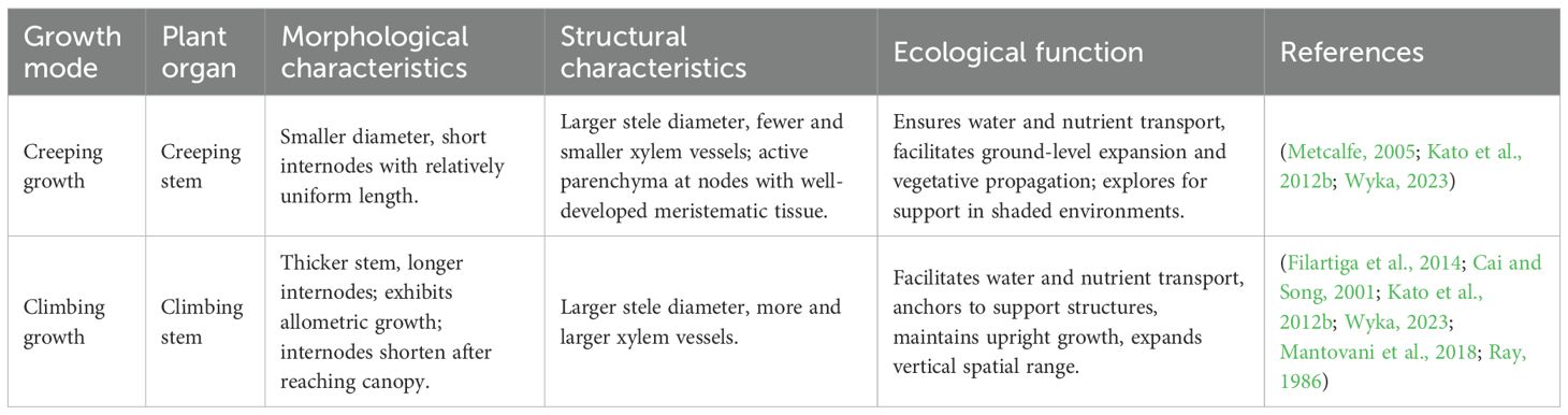Aroid vines typically have succulent stems, with some species having few branches. Vines often exhibit polymorphic stems, which include both creeping and climbing types (Metcalfe, 2005). During both creeping and climbing growth, the stems of aroid vines show characteristics of both types (Table 3; Figures 2C, D). Creeping stems of aroid vines are typically characterized by shorter internodes and smaller diameters, allocating a greater proportion of resources to leaf development and exhibiting heightened light sensitivity. In contrast, climbing stems generally possess longer and thicker internodes and develop specialized structures such as aerial roots to aid in attachment to supporting substrates. During the initial climbing phase, resources are primarily allocated to stem elongation, often accompanied by delayed leaf expansion (Cai and Song, 2001; Mantovani et al., 2018; Wyka, 2023). Unlike many other vines, however, creeping and climbing stems in aroid vines typically occur sequentially along the same axis, reflecting a gradual developmental transition rather than distinct structural forms. Furthermore, as the attachment height increases, the stele diameter of climbing stems enlarges, accompanied by an increase in both the number and size of xylem vessels (Filartiga et al., 2014). In contrast to the tapering xylem model observed in trees (West et al., 1999), this pattern forms an “inverted cone” structure, resembling that of Monstera acuminata (López−Portillo et al., 2000).