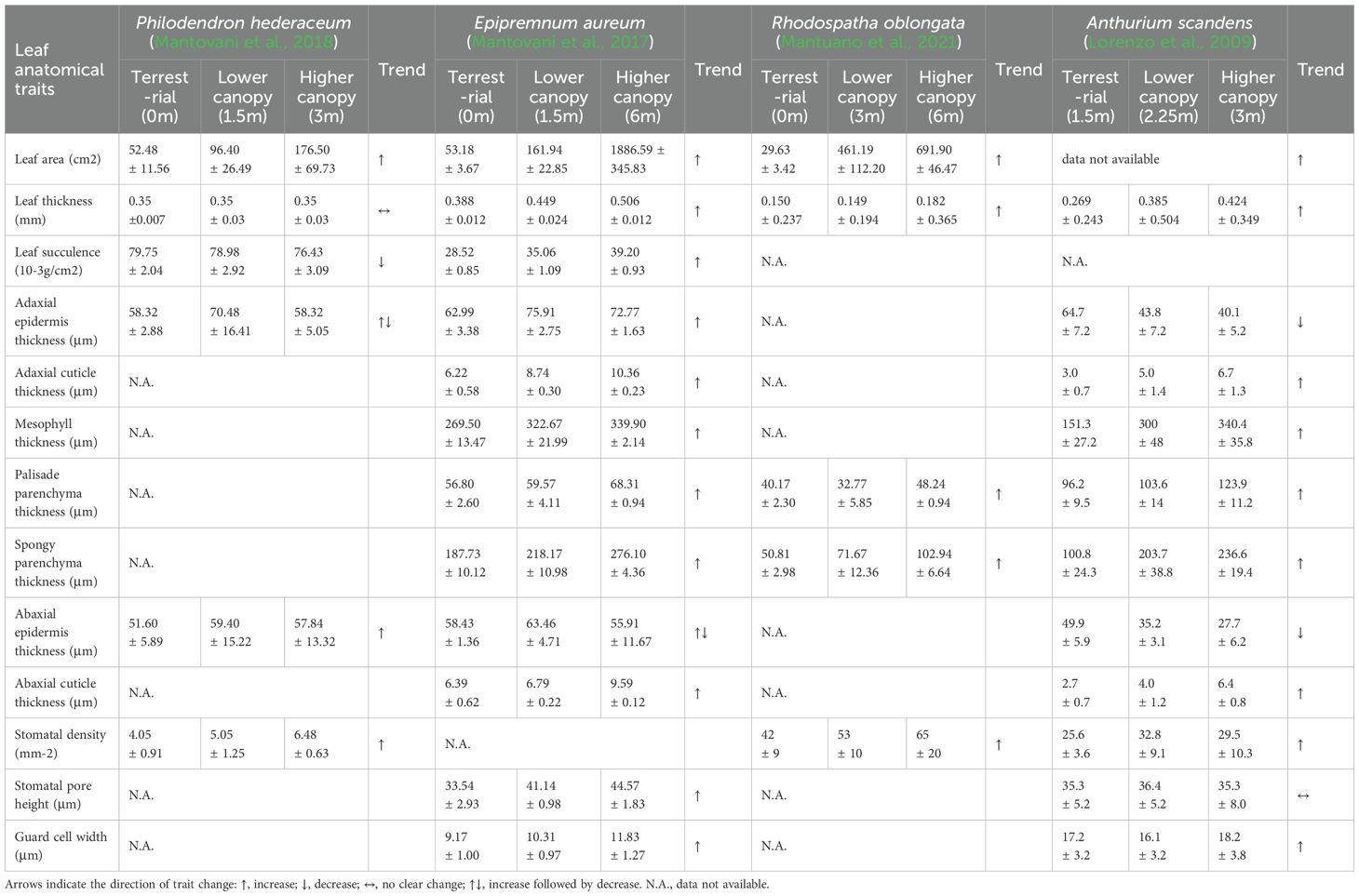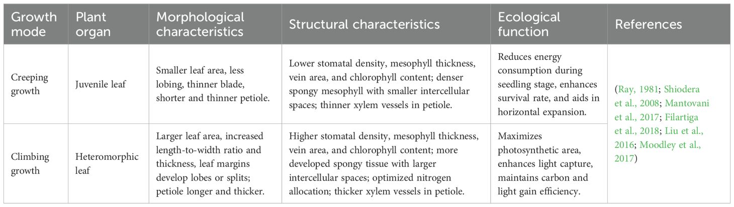 During the transition from creeping to climbing growth, aroid vines undergo a series of leaf morphological changes (Table 4; Figures 2A, B). Many aroid vines develop heterophylly, developing juvenile leaves during early growth stages and mature leaves during the adult phase (Nakayama, 2024; Mou et al., 2019). Heterophyllous leaf development is typically a gradual process that occurs progressively during the ascent from the forest floor to the upper canopy. Anatomically, leaf traits such as leaf area, leaf thickness, adaxial cuticle thickness, mesophyll thickness, palisade parenchyma thickness, spongy parenchyma thickness, abaxial cuticle thickness, stomatal density, stomatal pore height, and guard cell size generally increase with climbing height (Table 5). The petiole also becomes longer and thicker, with an increased vessel diameter in the xylem (Filartiga et al., 2018). This indicates a significant positive correlation between leaf and petiole traits in aroid vines. These plants tend to develop thicker leaves and epidermis, along with higher stomatal density, to reduce water loss and adapt to environments characterized by high light intensity and low humidity (Ardiningtyas et al., 2023). In addition, canopy leaves exhibit extended lifespans, ranging from 28 to 40 months (Shiodera et al., 2008). In terms of photosynthetic physiology, leaves in the upper canopy generally exhibit significantly higher levels of chlorophyll a, chlorophyll b, total chlorophyll, maximum electron transport rate, photosynthetically active radiation at maximum ETR, assimilation rate at light saturation, and total leaf nitrogen compared to lower canopy leaves (Mantovani et al., 2018, 2017; Mantuano et al., 2021; Lorenzo et al., 2009). However, in the absence of a supporting structure for climbing, plants may remain in a juvenile state indefinitely (Filartiga et al., 2021).