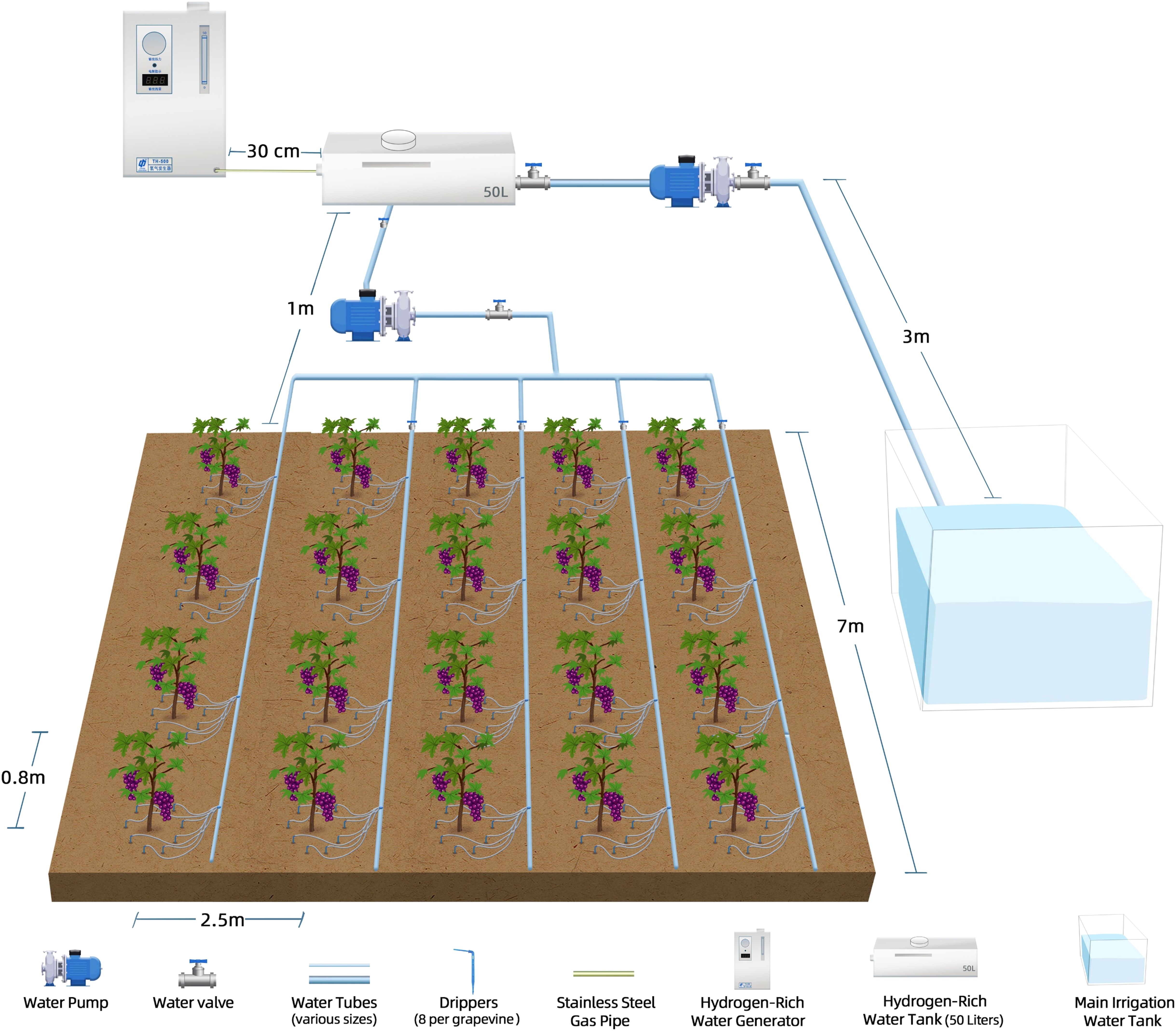 Figure 1. Schematic diagram of the experimental setup. The irrigation system includes a main irrigation water tank, a water pump, and a series of water tubes of various sizes connected to water valves and drippers (4per grape seedlings). The HRWgeneration and delivery system consists of a HRWgenerator, a stainless steel air pipe for gas transfer, and a 50-liter HRW tank. The system ensures the precise delivery of HRW to the grape seedlings through a subsurface irrigation network designed to optimize water distribution and efficiency.
