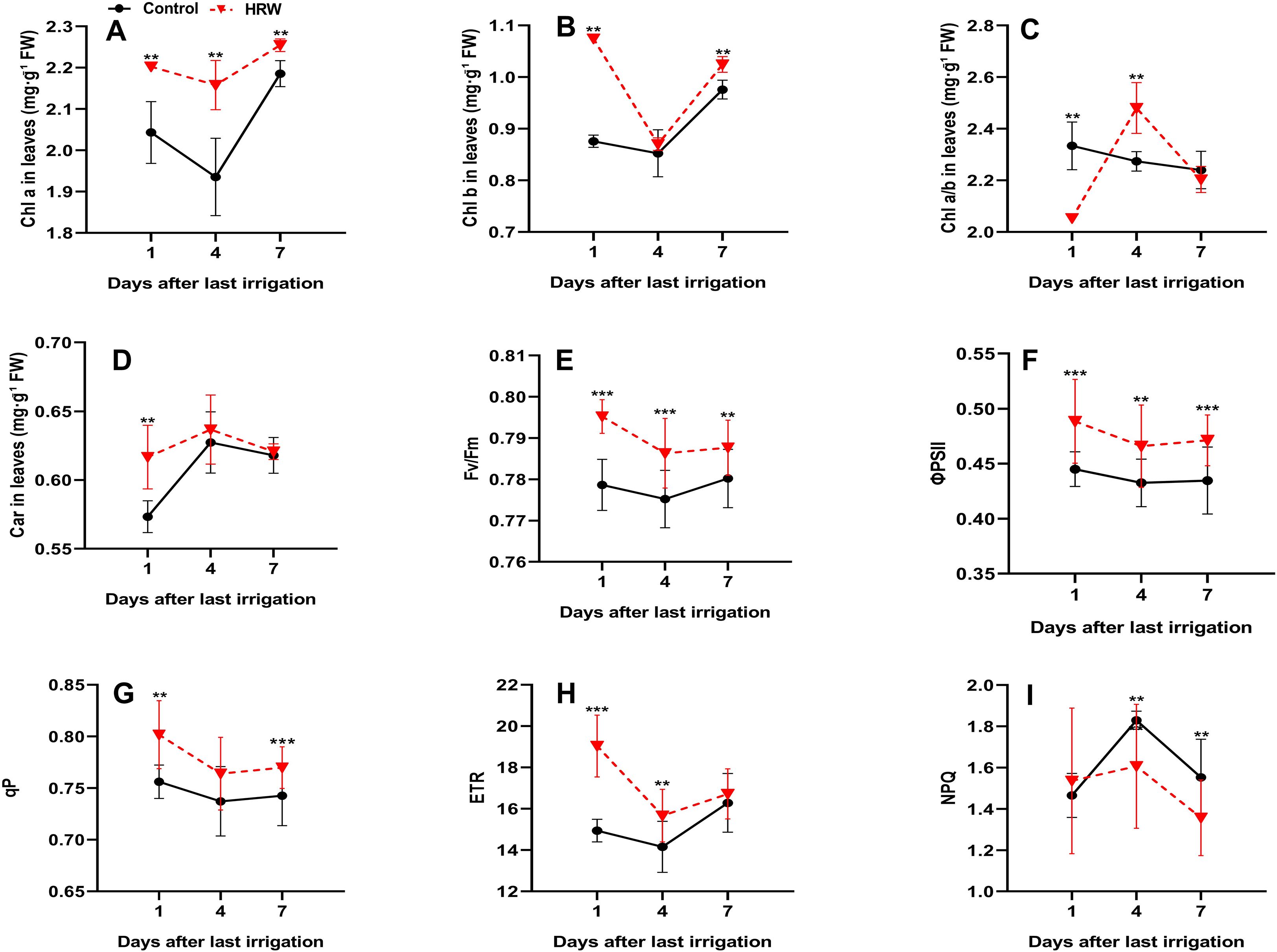 Figure 2. Effects of HRW treatment on chlorophyll a content (Chl a) (A), chlorophyll b content (Chl b) (B), chlorophyll a/b ratio (Chl a/b) (C), carotenoid content (Car) (D), maximal quantum yield of PSII (Fv/Fm) (E), photochemical quantum yield of PSII (ΦPSII) (F), photochemical quenching coefficient (qP) (G), electron transport rate (ETR) (H), and non-photochemical quenching (NPQ) (I) in ‘Flame Seedless’ grape leaves. Values (means ± SD) were from three replicates. Asterisks indicate significant differences from the control (Student’s t-test; *P< 0.05, **P< 0.01, ***P< 0.001).