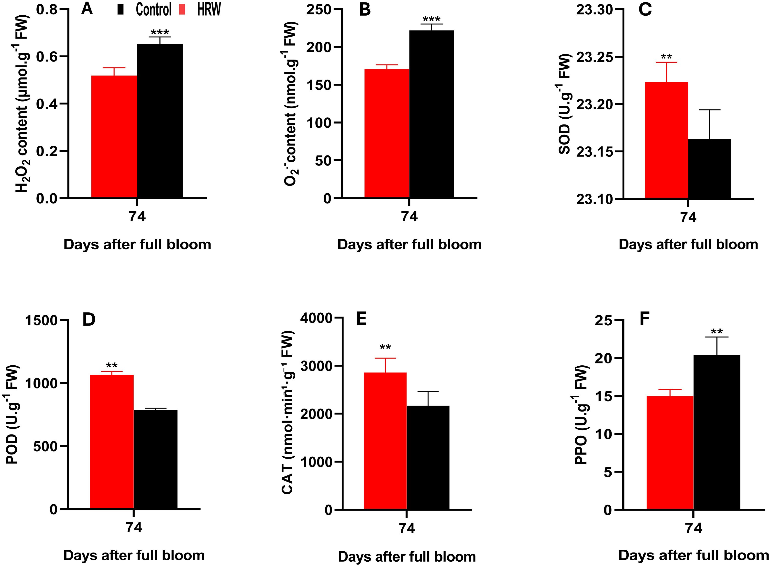 Figure 3. Effects of HRW treatment on hydrogen peroxide (H2O2) content (A), superoxide anion (O2˙-) content (B), and the activities of superoxide dismutase (SOD) (C), peroxidase (POD) (D), catalase (CAT) (E), and polyphenol oxidase (PPO) (F) in ‘Flame Seedless’ grape leaves. Data are presented as means ± SD from three replicates. Significant differences from the control were determined by Student’s t-test (**P< 0.01, ***P< 0.001).
