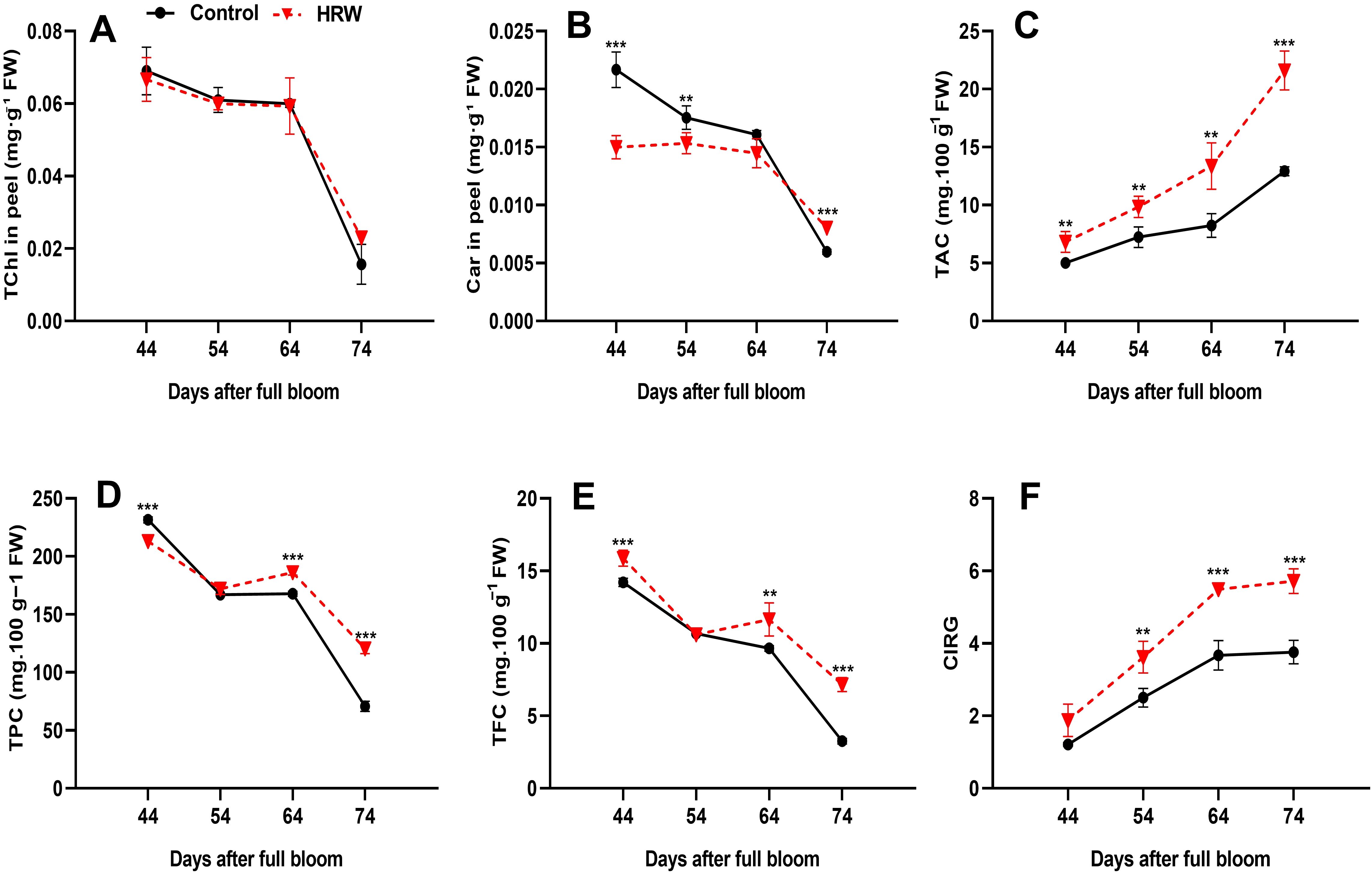 Figure 4. Effects of HRW treatment on total chlorophyll content (TChl) (A), carotenoid content (Car) (B), total anthocyanin content (mg cyanidin 3-O-glucoside 100 g-1 FW) (TAC) (C), total phenolic content (mg GAE 100 g-1 FW) (TPC) (D), total flavonoid content (mg QE 100 g-1 FW) (TFC) (E), and the color index of red grapes (CIRG) (F) in ‘Flame Seedless’ grape peel. Data are presented as means ± SD from three replicates. Significant differences from the control were determined by Student’s t-test (**P< 0.01, ***P< 0.001).