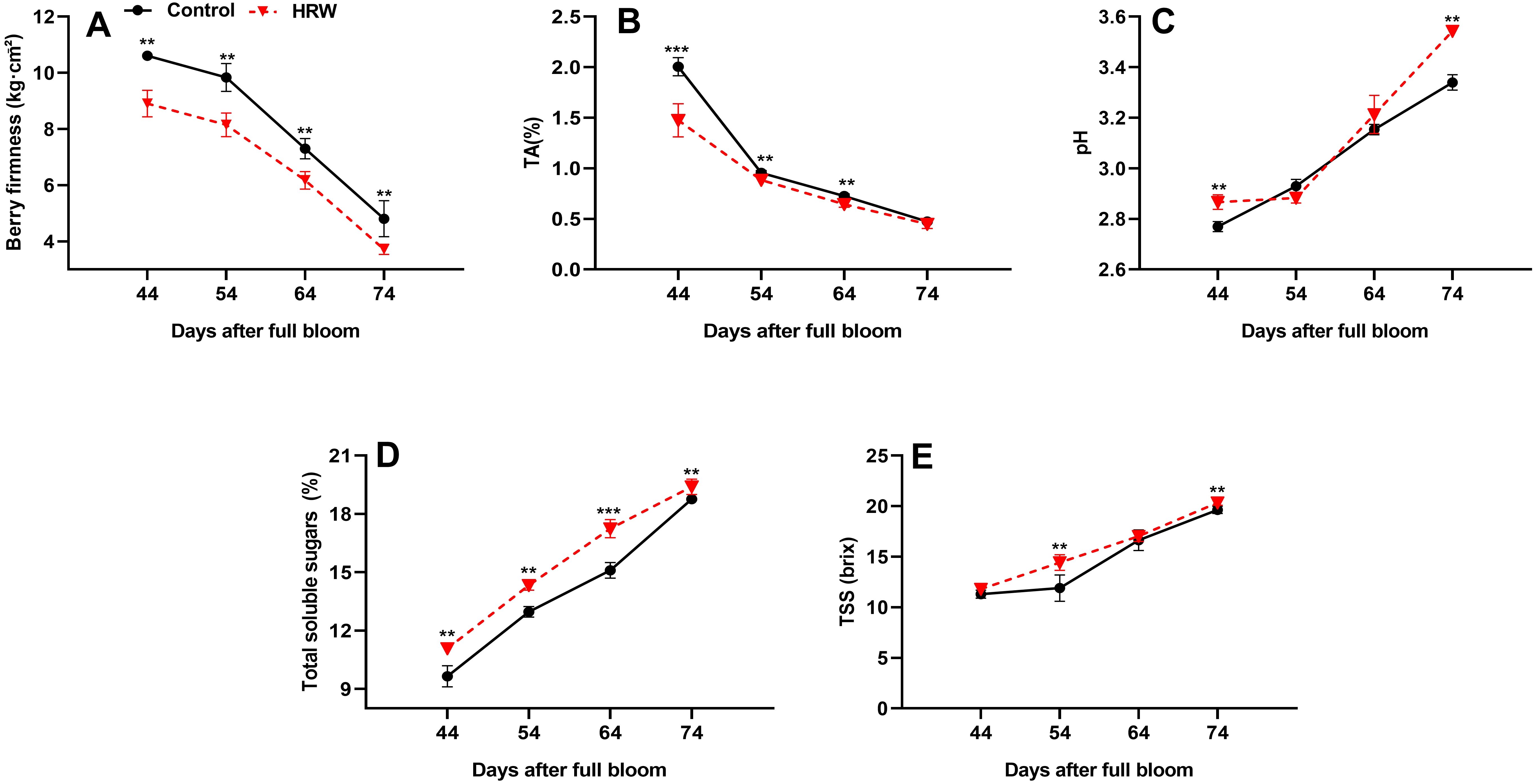 Figure 5. Effects of HRW treatment on fruit firmness (A), titratable acidity (TA) (B), pH (C), total soluble sugar (D), and total soluble solids (TSS) (E) in the berries of ‘Flame Seedless’ grapes. Values (means ± standard deviations) were calculated from three independent replicates. Asterisks indicate significant differences compared to the control (Student’s t-test; **P< 0.01, ***P< 0.001).