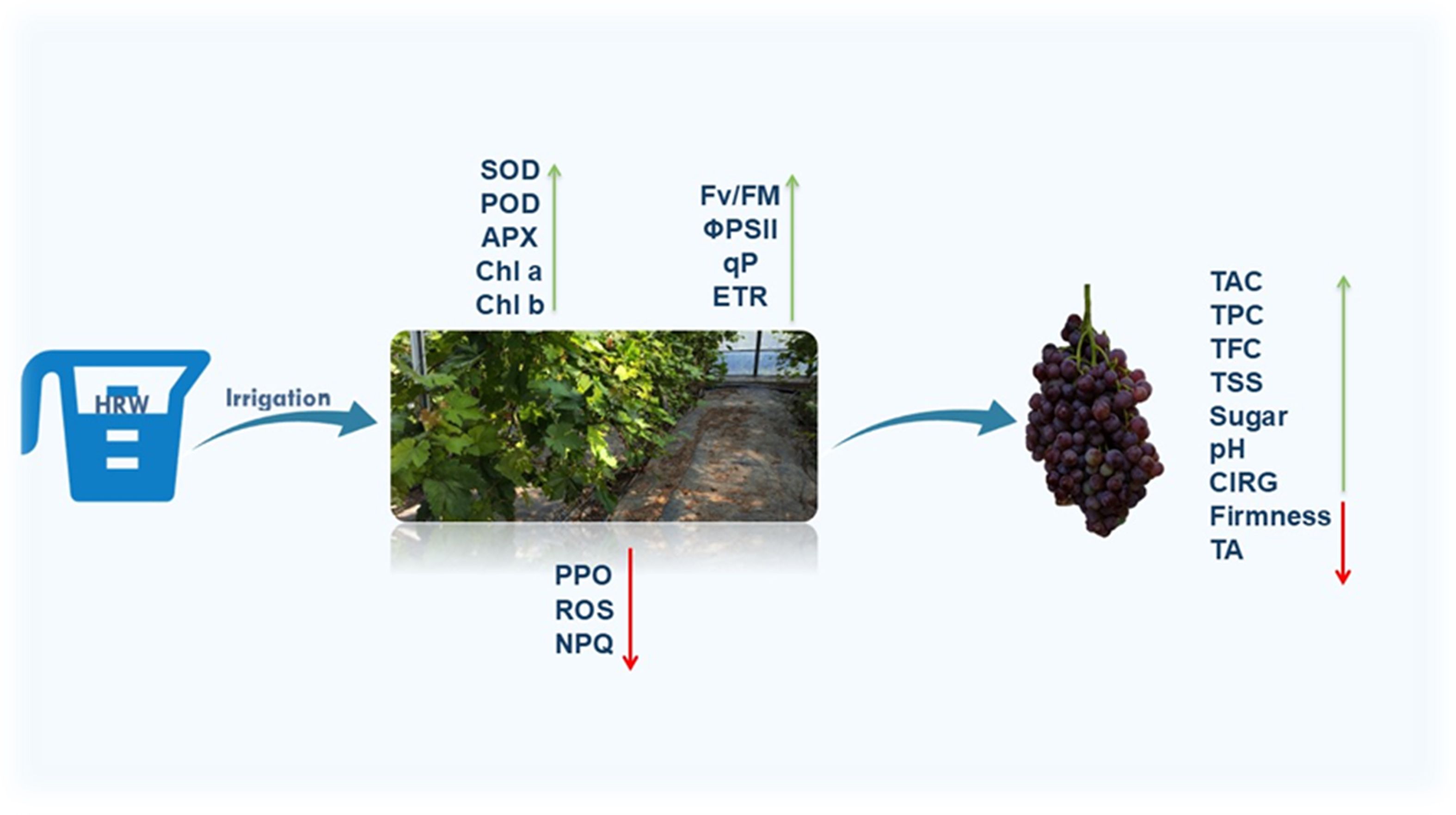 Results: HRW irrigation induced a significant increase in carotenoid (Car) content, which was observed only on the first day after irrigation. It also significantly enhanced chlorophyll a (Chl a) and chlorophyll b (Chl b) contents, as well as ChlF parameters such as maximum quantum efficiency of photosystem II (Fv/Fm), and the photochemical quantum yield of PSII (ΦPSII), while non-photochemical quenching (NPQ) decreased, indicating enhanced PSII functionality and photosynthetic performance. Antioxidant enzyme activities, including superoxide dismutase (SOD), peroxidase (POD), and catalase (CAT), were also enhanced, reducing reactive oxygen species (ROS) accumulation and maintaining ROS homeostasis in grapevine leaves. HRW treatment promoted the accumulation of secondary metabolites such as total phenolic content (TPC), total flavonoid content (TFC), total anthocyanin content (TAC), and Car, which contributed to an improved color index of red grapes (CIRG). Additionally, fruit quality was improved by increasing total soluble solids (TSS), soluble sugars, and pH, while reducing fruit firmness and titratable acidity (TA). Berry weight and overall yield were also enhanced compared with control plants.
