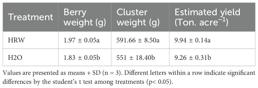 Table 1. Effect of irrigation with HRW on berry weight, cluster weight, and yield of “Flame seedless” grapes.