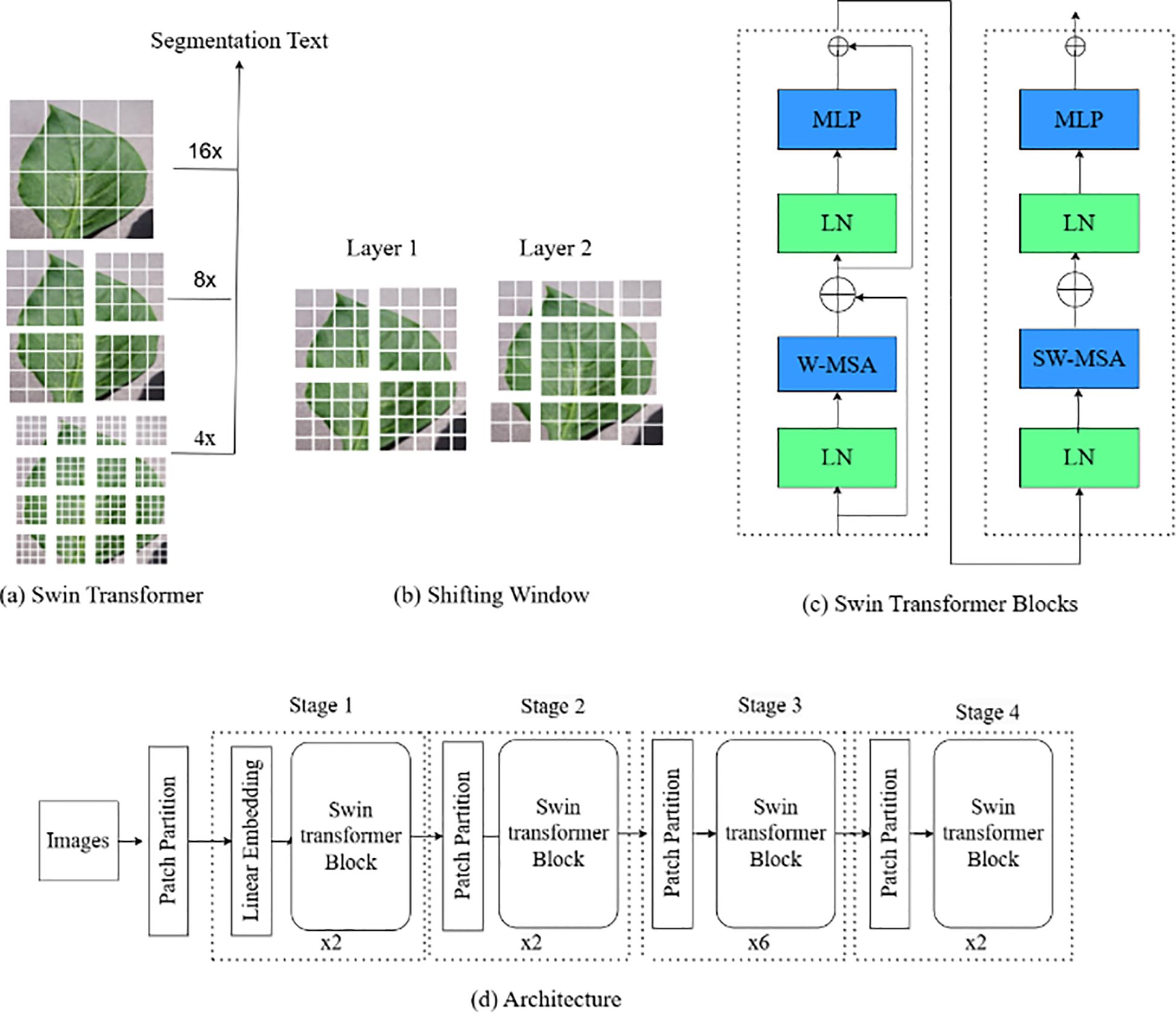 The Swin Transformer (ST) V2 is an advanced version of TNN model designed for image classification and segmentation tasks. Unlike traditional CNN-based architectures, Swin Transformer V2 leverages a hierarchical structure of local windows and shifts to better capture both local and global context in the image, as presented in Figure 7. The model improves upon the original Swin Transformer by enhancing the efficiency, scalability, and performance on large-scale vision tasks.