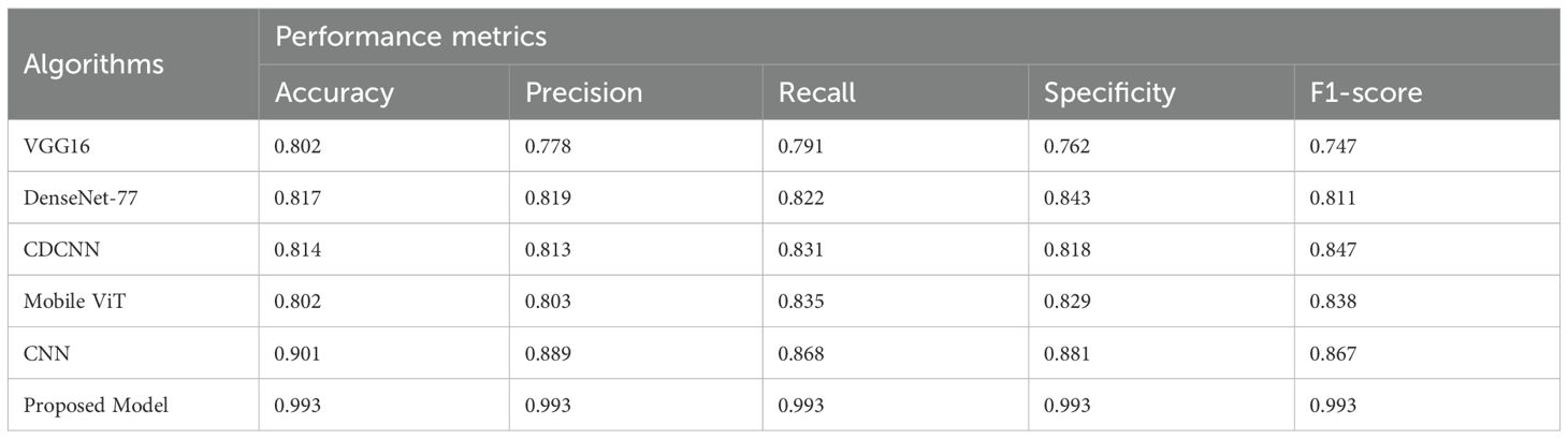 Table 5 shows the performance measures of different learning methods that have been tested on a real-time data (supplied by webcams in natural field settings). The real life aspects in the images include lighting differences and noise on the background whereby 10 different classes of 5 different plants are captured. The validation was conducted on almost 200 pictures that were gathered and used. As per Table 5, no model is better than the suggested model proving its perfection and ability to be used in real-time scenarios in the agricultural sector.