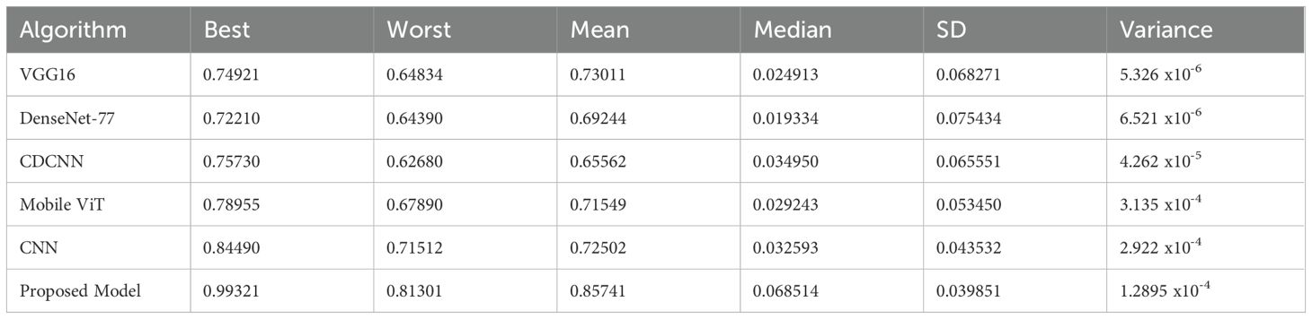 In the process of carrying out our investigation, we have prepared a statistical account of different optimizers, which is depicted in Table 7. This comparison analysis is important to analyze the peculiarities of the work of each optimization algorithm in the conditions of the proposed system of plant diseases diagnosis. The Table 7 summarizes the important measurements like the best, worst, mean, median, standard deviation (SD) and variance of the model met by each optimizer. Table 8 shows a comparative assessment of MBT model with other baseline models in order to see its diagnostic efficiency with different plant diseases.