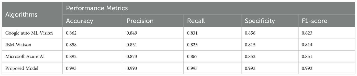 Compared the suggested model with other existing plant disease diagnosis systems to determine the effectiveness of the proposed model; Table 4 is given below. The outcomes confirm the effectiveness of our model regarding accuracy and efficiency, which seems especially high, considering the absence of the dependence on specialized hardware. This characteristic makes our solution an affordable and universally available feature to different user groups.