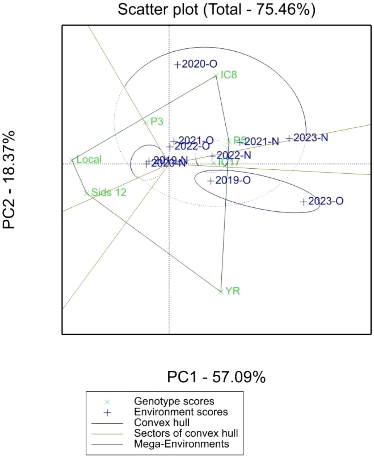 A GGE biplot was constructed using principal component analysis, wherein the scores of genotypes were multiplied by the corresponding environmental scores to produce a two-dimensional representation (Yan and Wu, 2008). This approach enabled a simultaneous assessment of both the main effects of genotypes and their interactions with the environment.