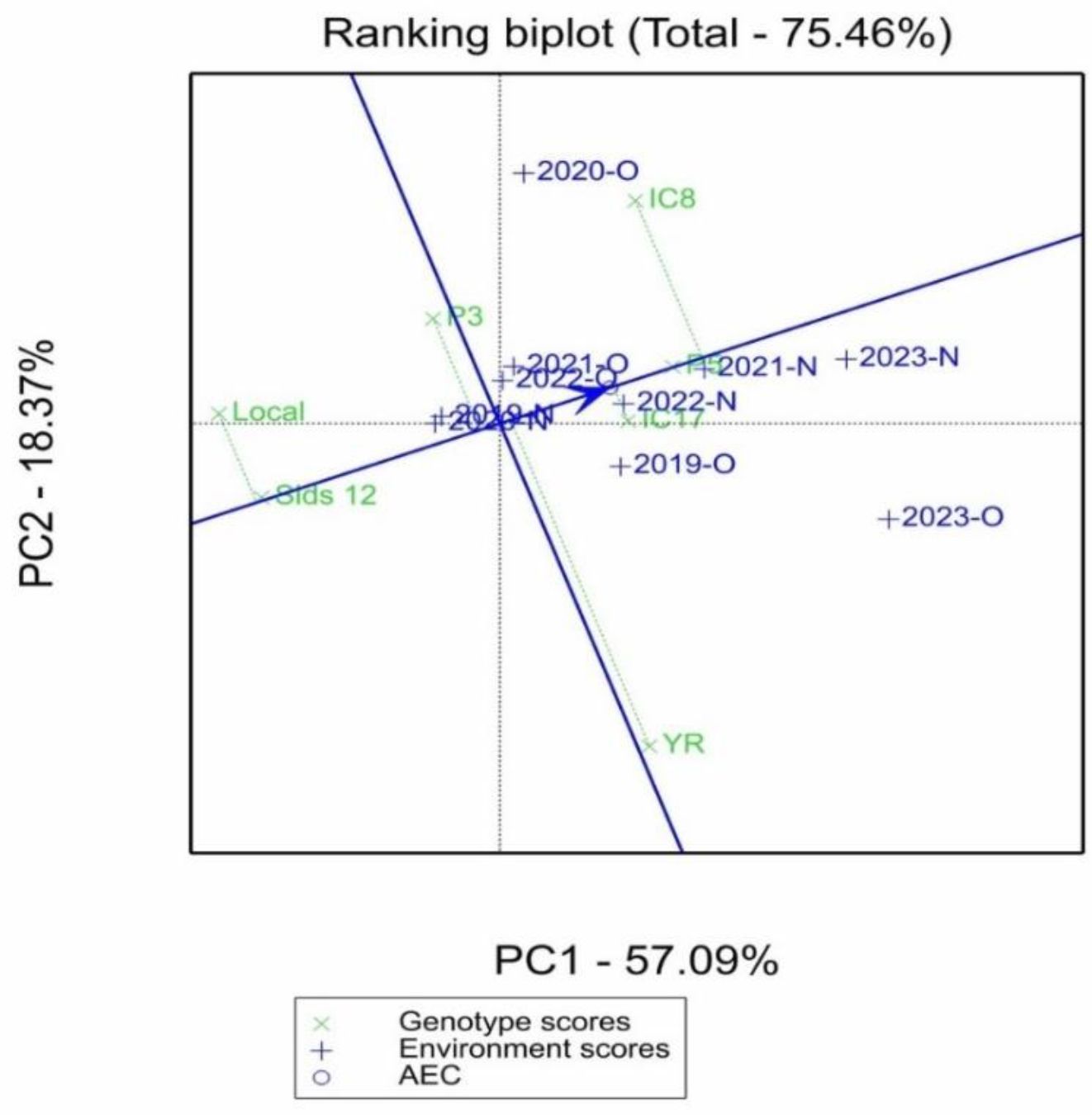 Figure 4 displays a ranking biplot that explains 75.46% of the total variation in genotype and environmental scores, with the first principal component (PC1) explaining 57.09% of the variance and the second component (PC2) explaining 18.37%. Genotypes are represented by green crosses, while environments are depicted by blue crosses with vectors. The average environment coordination (AEC) axis, shown as a blue line, indicates the average performance of genotypes across environments. The AEC circle helps visualize the distance of environments from the average performance. The genotypes “IC8,” “LOCAL,” and “P3” are spread close to the AEC, indicating stability in their performance across different environments. Conversely, “YR” and “IC8” are separated along PC1 and PC2, suggesting more specific adaptation to certain environments. Environments such as “2020-O” and “2023-O” are farther along the AEC axis, suggesting that they either posed challenges or provided advantages that influenced genotype performance.