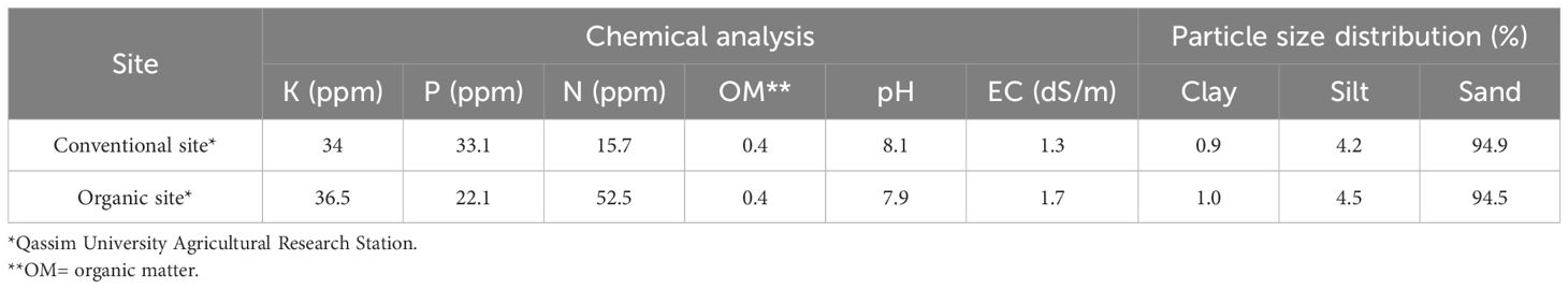 Field experiments were conducted over five consecutive growing seasons from 2019 to 2023 at the Agricultural Research and Experimental Station of Qassim University, Buraydah, Saudi Arabia (26°18′28″ N, 43°46′ E). The site is characterized by sand texture with low salinity (electrical conductivity, EC=1.5 dSm-1), low organic matter content (0.4%), and an alkaline pH of 8.1. The irrigation water used throughout the study had an EC of 1.7 dSm-1 and a pH of 7.8.