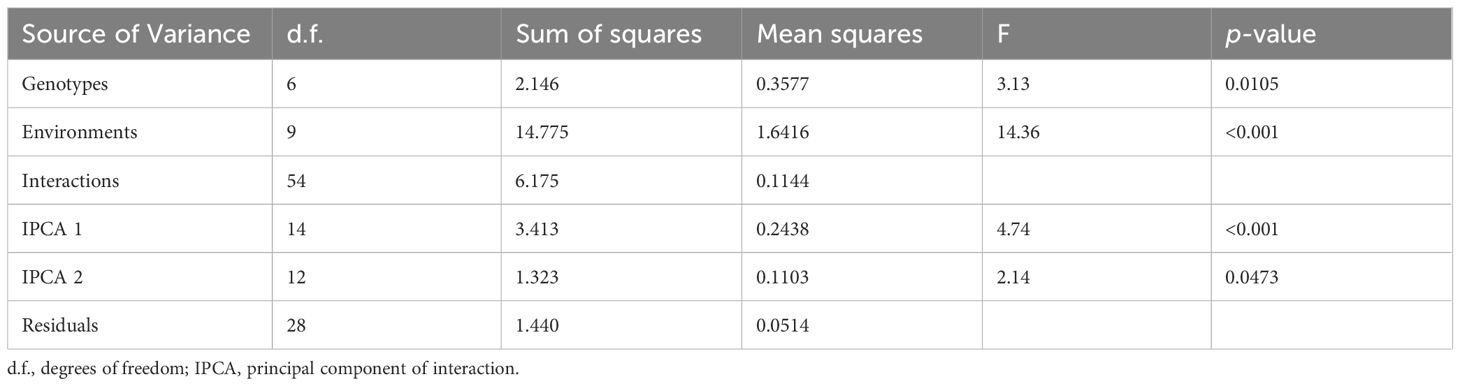 The ANOVA results (Table 4) obtained for the AMMI model clearly indicate the significant effects of both genotype and environment on the traits under consideration, supporting the hypothesis that performance varies across different conditions and genetic backgrounds. The interaction between genotypes and environments was also significant, with the first principal component (IPCA1) showing a high variance ratio (v.r. = 4.74; p< 0.001). The second principal component (IPCA2) was also significant (v.r. = 2.14; p<0.0473), indicating that specific genotype responses varied across environments.