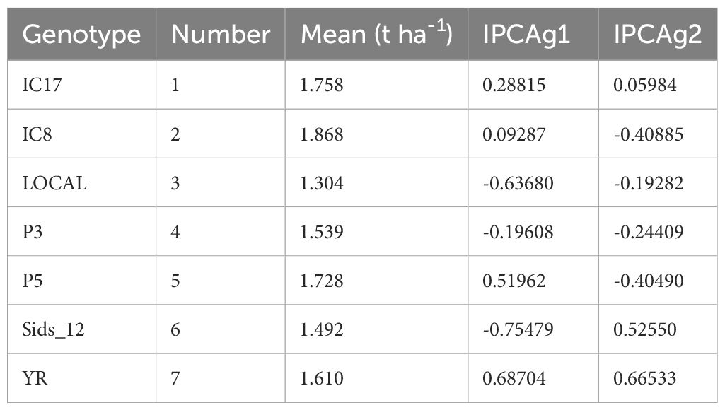 The mean performance and IPCA scores for each genotype revealed differences in adaptability and stability (Table 5). IC8 (mean = 1.868t ha-1) exhibited the highest mean performance among the tested genotypes and had a positive IPCA score in the first principal component, indicating favorable interactions with certain environments. IC17 (mean = 1.758t ha-1) also performed well, with a positive IPCAg1 score, suggesting its relative stability across environments. In contrast, LOCAL (mean = 1.304t ha-1) had the lowest mean performance and negative IPCA scores in both components, indicating its performance was less favorable across environments. Sids_12 had a mean of 1.492t ha-1, with a high positive IPCAg2 score, suggesting that it performed well under certain environmental conditions but may not be stable across all environments.