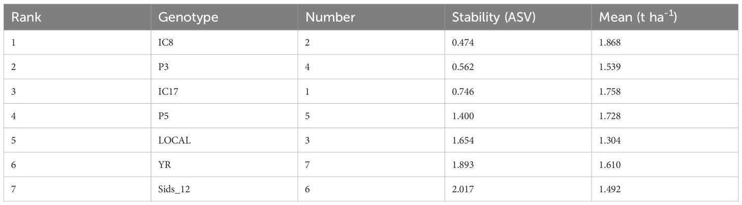 The ASVs provided insights into the performance and adaptability of genotypes across different environments (Table 6). Lower ASVs indicated greater stability, which means that the genotype is less affected by environmental changes. The AMMI analysis identified IC8 (ASV=0.474) as the most stable genotype with the highest mean yield (1.868t ha-1), indicating consistent performance across varying conditions. In contrast, Sids_12 (ASV=2.017) was ranked the least stable, suggesting it is more sensitive to environmental changes despite a mean yield of 1.492t ha-1. P3 and IC17 ranked second and third in stability, also showing relatively high mean yields of 1.539 and 1.758t ha-1, respectively. This balance between stability and yield performance is valuable for selecting genotypes for breeding programs. Conversely, LOCAL (ASV=1.654) and YR (ASV=1.893) exhibited high instability, indicating that they may perform well only under specific conditions but lack broad adaptability.