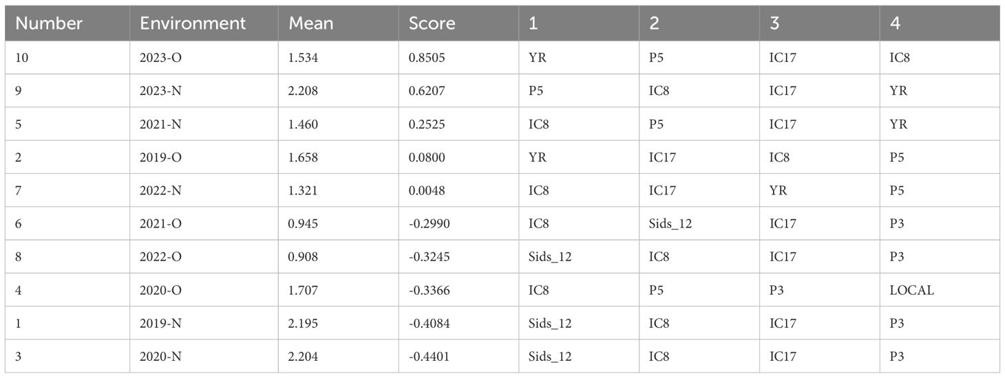 The AMMI analysis revealed the first four genotype selections for each environment based on their performance (Table 7). The highest mean yield was recorded in environment 2023-N (2.208t ha-1), followed closely by 2020-N (2.204t ha-1) and 2019-N (2.195t ha-1). These environments demonstrated favorable conditions for high-yielding genotypes. Conversely, environments such as 2022-O (0.908t ha-1) and 2021-O (0.945t ha-1) had the lowest mean performance, indicating suboptimal conditions for yield expression. Genotype IC8 emerged as the most frequently selected across environments, appearing in the top four rankings in nine out of ten environments. This highlights its broad adaptability and stability across varying conditions. Other frequently selected genotypes include IC17, P5, and YR, indicating their suitability for specific environments. Sids_12 was also prominent in environments such as 2022-O, 2020-N, and 2019-N, suggesting its potential for high performance in targeted conditions. The AMMI interaction scores varied significantly across environments. Environments such as 2023-O (0.8505) and 2023-N (0.6207) had high scores, demonstrating strong genotype-by-environment interaction effects. Lower interaction scores in environments such as 2022-N (0.0048) and 2021-O (-0.2990) suggest reduced genotype-by-environment interaction, emphasizing the role of stable environmental conditions.