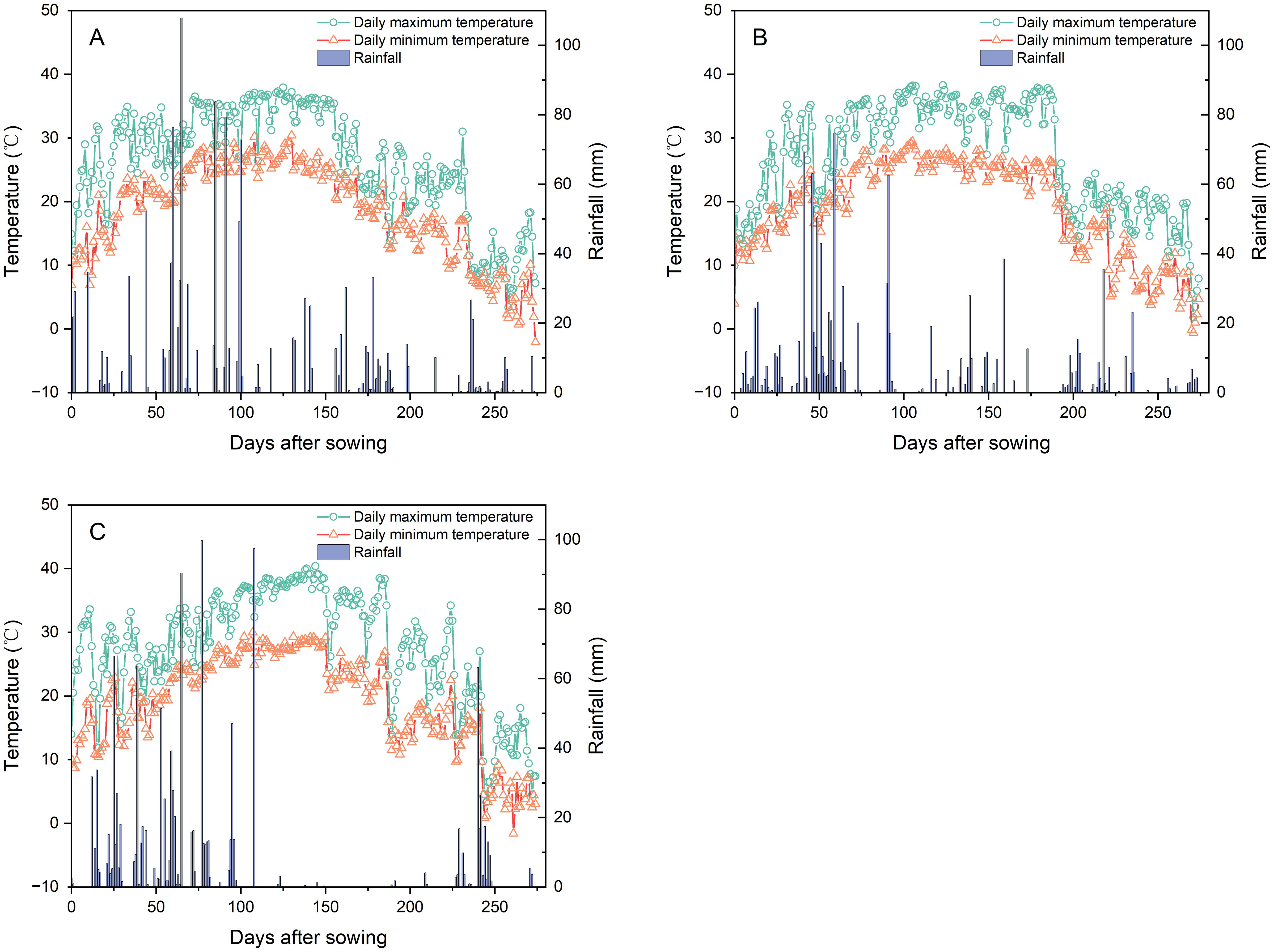 Figure 1. Daily temperatures (maximum/minimum) and precipitation during the Pueraria thomsonii growing seasons in 2020 (A), 2021 (B), and 2022 (C).