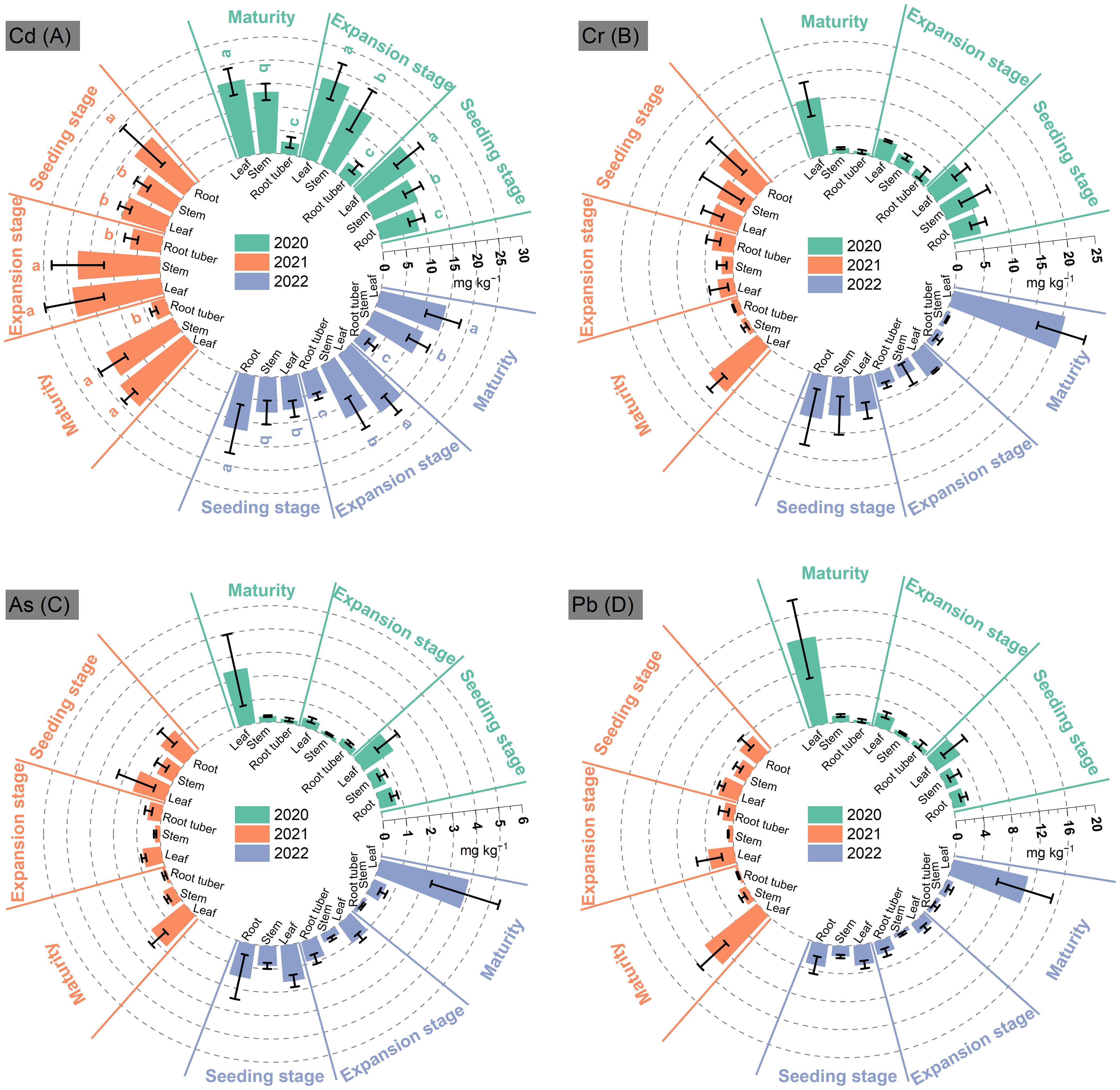 Figure 2. Contents of Cd (A), Cr (B), As (C), and Pb (D) in Pueraria thomsonii tissues at different growth stages during 2020–2022. SN, seeding stage; EP, expansion stage; MA, maturity. Columns represent the means of 12 replicates with vertical bars indicating standard errors. Different lowercase letters denote significant differences at the 0.05 probability level within a year.