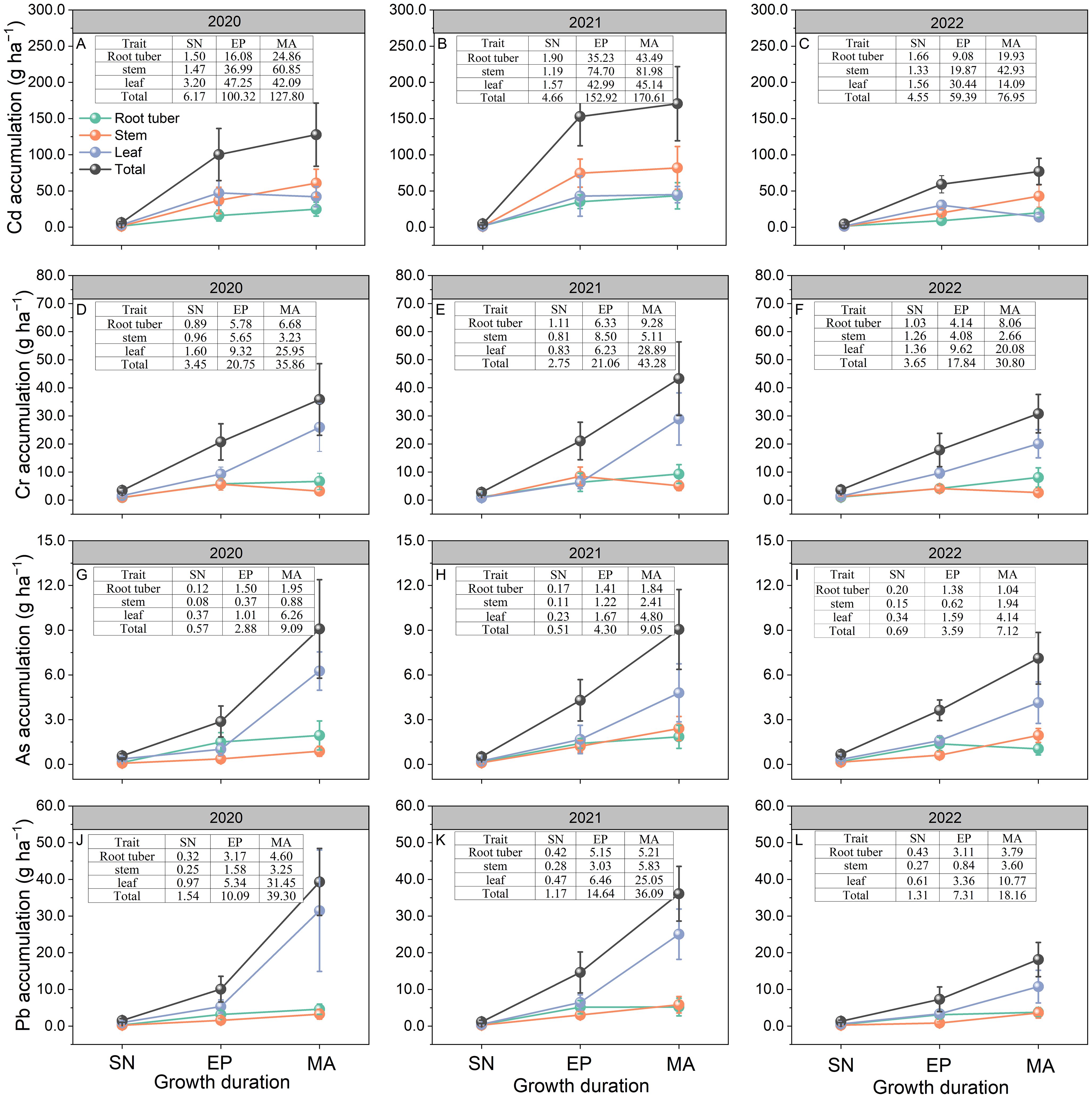Figure 3. Accumulation of Cd (A–C), Cr (D–F), As (G–I), and Pb (J–L) in Pueraria thomsonii tissues at different growth stages during 2020–2022. Data represent the means of 12 replicates with vertical bars indicating standard errors. SN, seeding stage; EP, expansion stage; MA, maturity. The data in the tables represent the data corresponding to each point in the subgraph.
