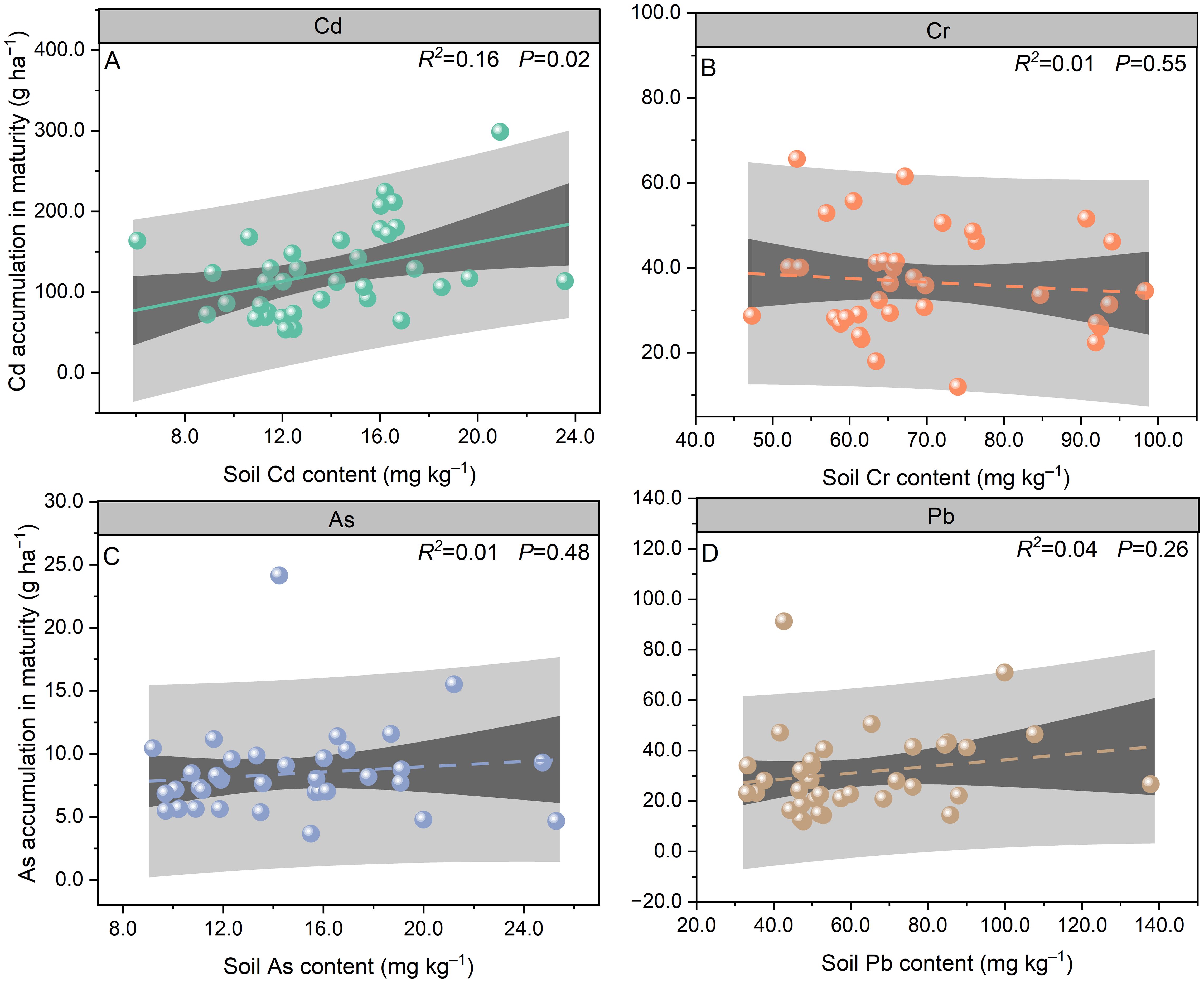 Figure 4. Relationships of soil Cd (A), Cr (B), As (C), and Pb (D) contents to total Cd (A), Cr (B), As (C), and Pb (D) accumulation in Pueraria thomsonii during 2020–2022 (n = 36). Data are the 36 replications in 3 years.