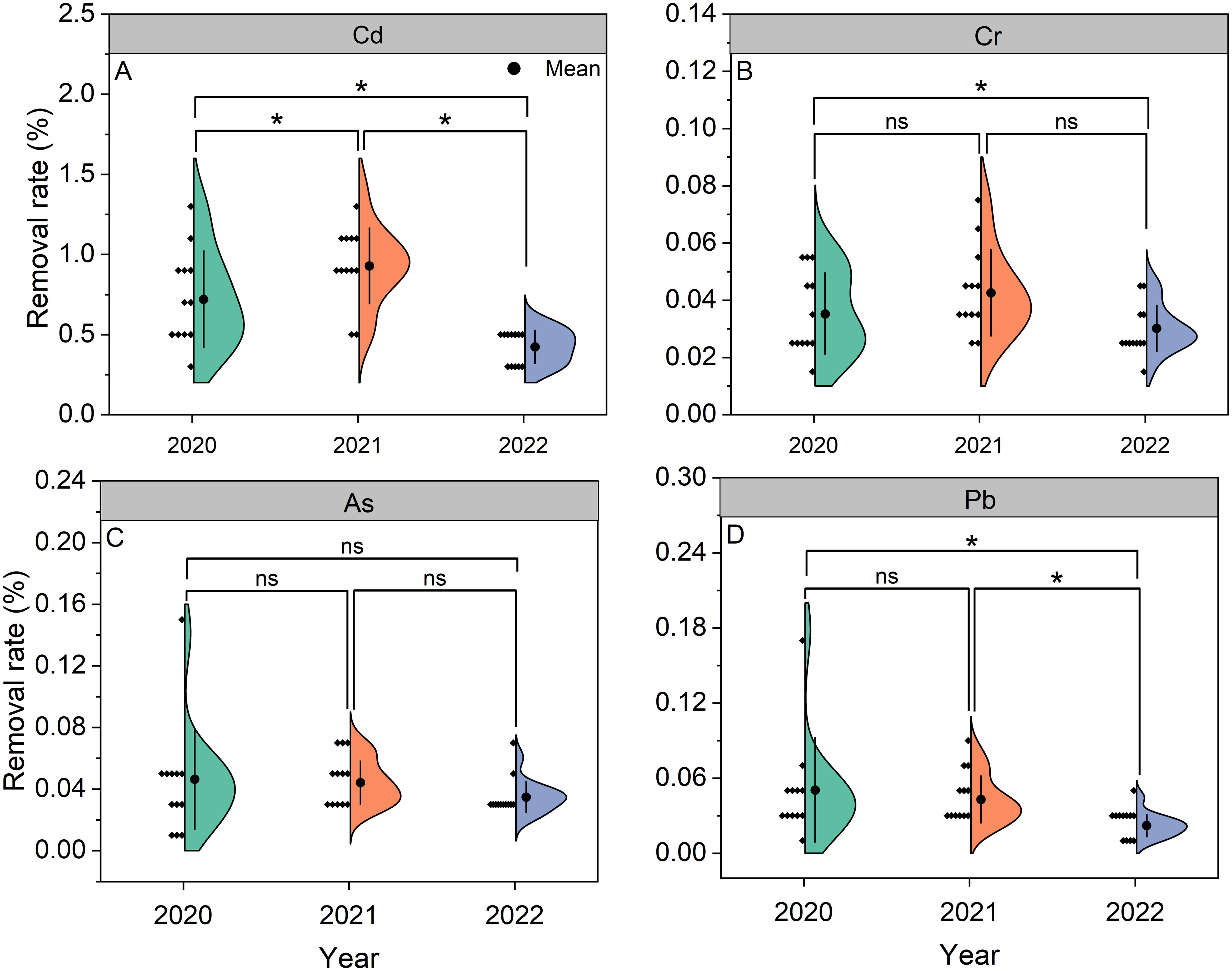 Figure 5. Removal rates of Cd (A), Cr (B), As (C), and Pb (D) in Pueraria thomsonii during 2020–2022. Solid dots represent the means of 12 replicates. *denotes significance at the 0.05 probability level; nsdenotes non-significance at the 0.05 probability level.