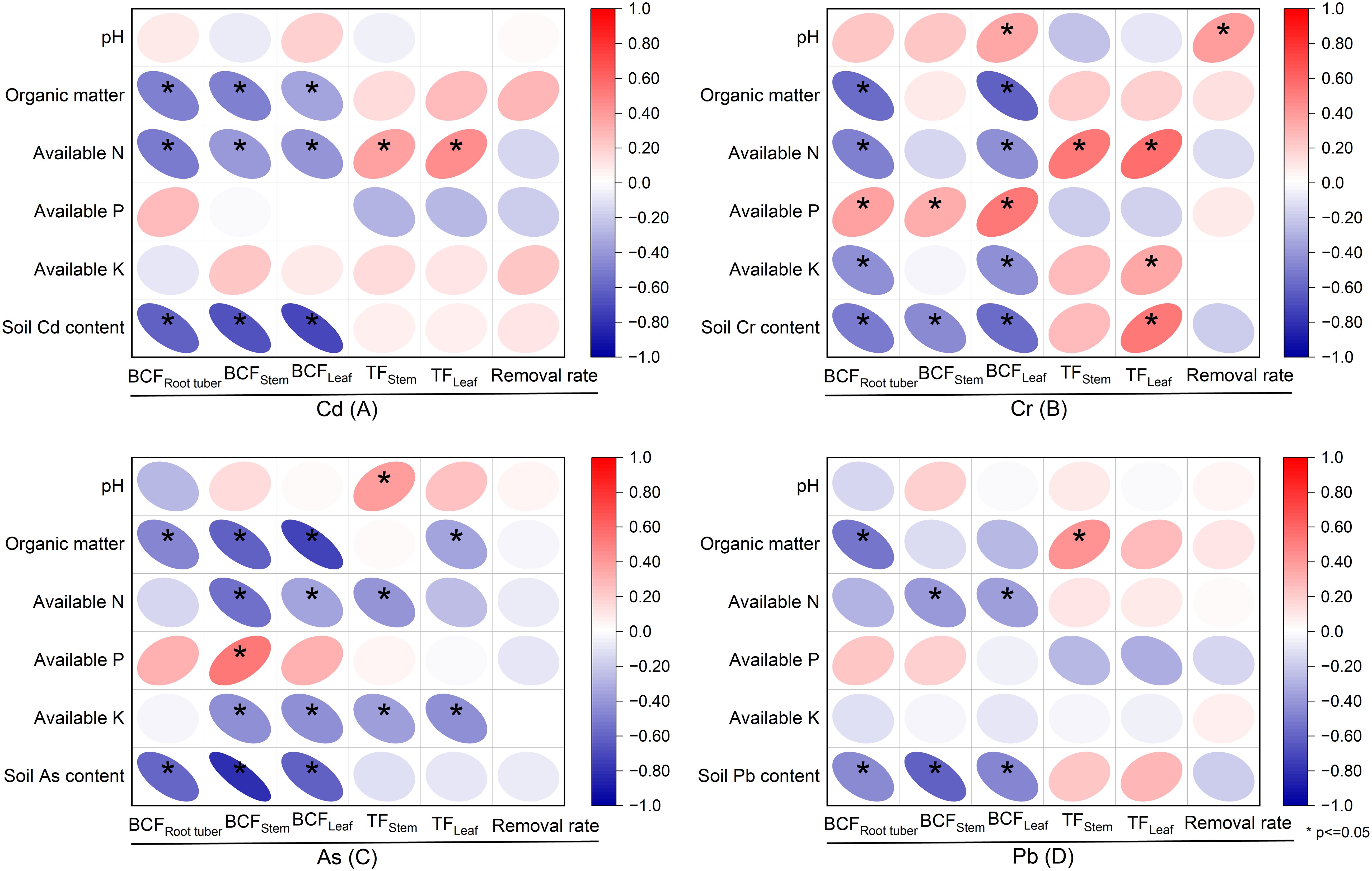 Significant negative correlations were observed between soil content of Cd, Cr, As, and Pb and their respective BCF values in root tubers, stems, and leaves (P < 0.05; Figures 6A–D). However, soil Cr content showed a positive correlation with leaf TF of Cr (P < 0.05; Figure 6B). For Cd, organic matter and available N were negatively correlated with the BCF in root tubers, stems, and leaves (P < 0.05). Conversely, available N also showed a positive correlation with stem and leaf TF of Cd (P < 0.05; Figure 6A). No significant correlation was observed between soil pH and the BCFs and TFs in root tubers, stems, and leaves for Cd. Regarding Cr and As, leaf BCF showed a negative correlation with organic matter, available N, and available K, but a positive correlation with available P (P < 0.05; Figures 6B, C). Available N and available K were positively correlated with leaf TF of Cr (P < 0.05; Figure 6B). Leaf TF of As showed a negative correlation with organic matter and available K (P < 0.05; Figure 6C). Leaf BCF of Pb was negatively correlated with available N (P < 0.05; Figure 6D).