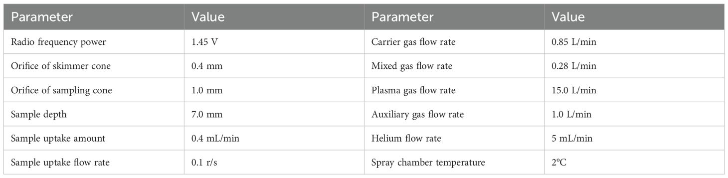 At the seeding stage (SN), expansion stage (EP), and maturity stage (MA), five hills of plants were randomly sampled in each plot. Kudzu plants were separated into roots, stems, and leaves at the seeding stage and separated into root tubers, stems, and leaves at the expansion and maturity stages. These components were then dried in an oven at 70°C to a constant weight to determine biomass production. The oven-dried samples at the three stages were ground into a powder. Approximately 0.1 g of each powder was used to determine the content of heavy metals (Cd, Cr, As, and Pb) using ICP-MS (Agilent 7900, USA) according to the method described by Wan et al (Wan et al., 2019). The operating conditions for ICP-MS were set according to the method of Xie et al (Xie et al., 2020), as detailed in Table 2. The BCF was calculated as the heavy metal content in kudzu tissues (including root tuber, stem, and leaf) to that in soil. The TF was calculated as the heavy metal content in stems or leaves to that in the root tuber. The removal rate was calculated as heavy metal accumulation at MA in kudzu per hectare to heavy metal accumulation in surface soil per hectare, with a soil depth of 20 cm and a bulk density of 1.2 g cm−3. The heavy metal accumulation was determined by multiplying the metal content in plant tissues by the corresponding biomass production at each growth stage.
