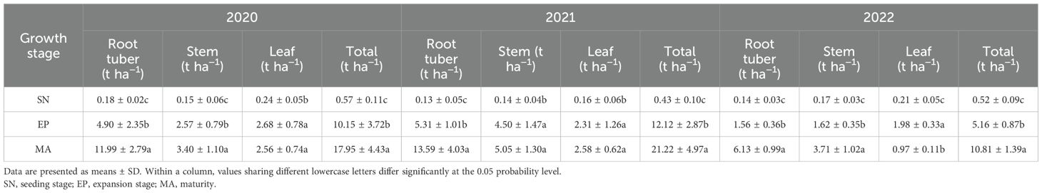 Total and root tuber biomass of P. thomsonii increased significantly from the SN to the MA stage across all three experimental years (Table 3). Specifically, the total biomass at EP and SN was substantially lower than at MA, with reductions of 59% and 98% in 2020, 61% and 99% in 2021, and 75% and 98% in 2022, respectively. A similar trend was observed for root tuber biomass. At MA, the total biomass ranged from 10.81 to 21.22 t ha−1, with the biomass of root tubers, stems, and leaves ranging from 6.13 to 13.59, 3.40 to 5.05, and 0.97 to 2.58 t ha−1, respectively, from 2020 to 2022.