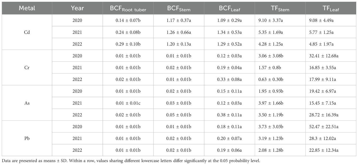 The BCF values for Cd in root tubers ranged from 0.14 to 0.29, while stem BCF values and leaf BCF values ranged from 1.09 to 1.34 across the 3 years (Table 4). Compared to stems and leaves, root tuber BCF values were consistently lower by 88% and 87% in 2020, 82% and 82% in 2021, and 76% and 78% in 2022, respectively. For Cr, As, and Pb, root tuber and stem BCF values exhibited reductions of 75%–97% relative to leaf BCF values across the 3 years.