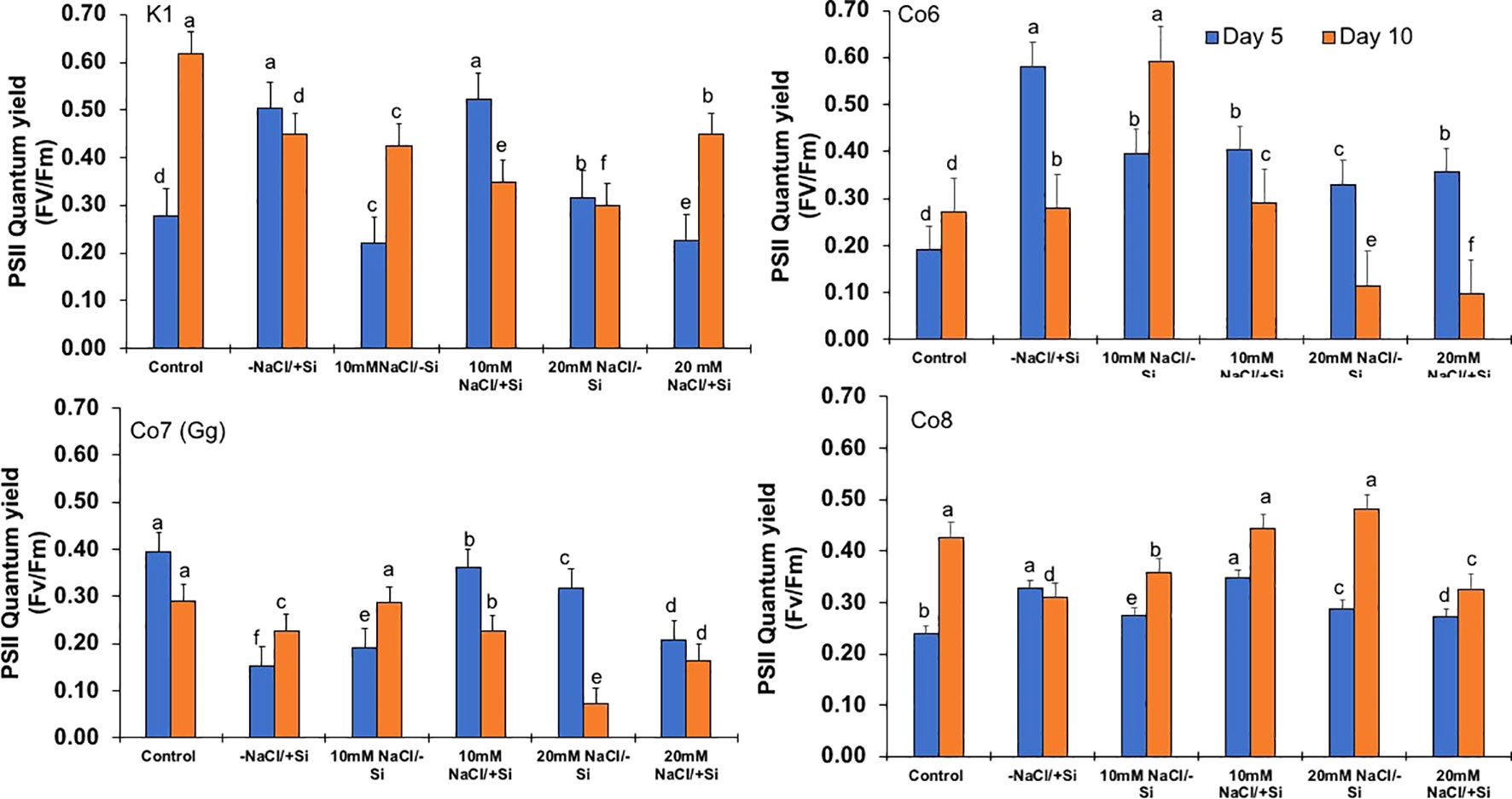 Bar charts titled K1, Co6, Co7(Gg), and Co8 show PSII Quantum Yield (FV/Fm) under different treatments. Each chart compares Day 5 (blue bars) and Day 10 (orange bars) yields. Treatments include Control, -NaCl/+Si, 10mM NaCl/-Si, and others. Error bars are present, and statistical significance is indicated by letters above bars.