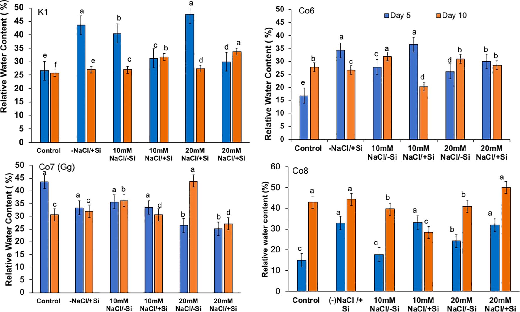 Bar charts show relative water content (%) for different treatments over five and ten days (K1, Co6, Co7(Gg), and Co8). Treatments include control, NaCl/Si combinations. Bars are color-coded: blue for day five and orange for day ten. Statistical significance is indicated by different letters above bars.