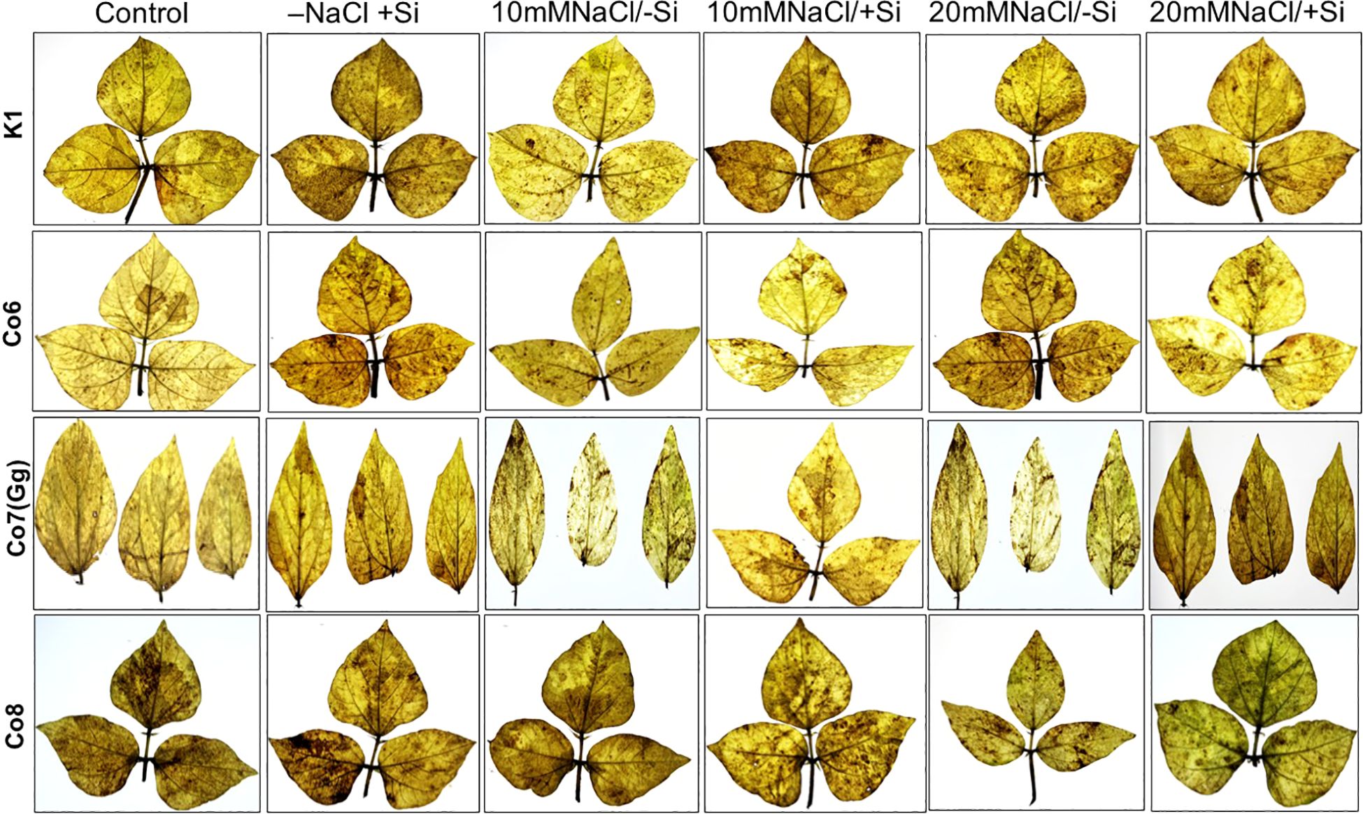Rows of plant leaves under different conditions, labeled K1, Co6, Co7(Gg), and Co8. Columns display treatments: Control, −NaCl/+Si, 10NaCl/−Si, 10NaCl/+Si, 20NaCl/−Si, and 20 NaCl+Si. Leaves vary in color and appearance across treatments.