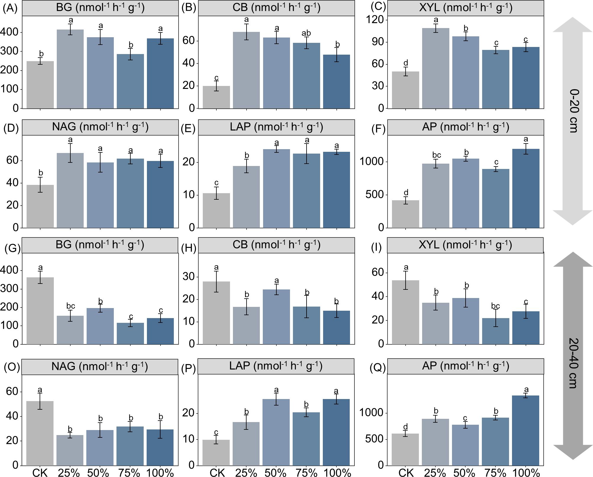 Bar charts showing enzyme activity at different soil depths (0-20 cm and 20-40 cm). Each panel (A-Q) represents a specific enzyme: BG, CB, XYL, NAG, LAP, and AP. Four treatments (CK, 25%, 50%, 75%, 100%) are compared, with letters indicating statistical significance. The charts illustrate variations in enzyme activity across treatments and depths.