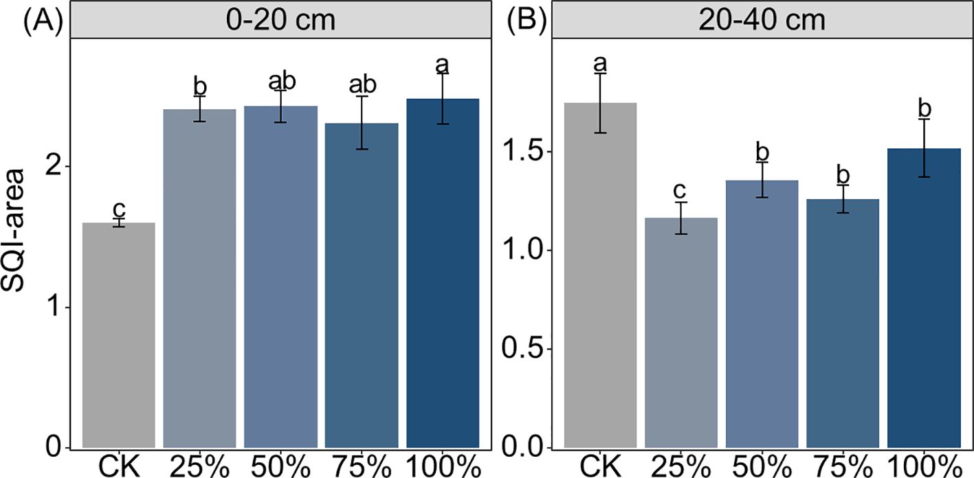 Bar graphs illustrating Soil Quality Index (SQI) area for different treatments at two soil depths: 0-20 cm (A) and 20-40 cm (B). In section A, SQI increases from CK to 100%, with values ranging from approximately 1.2 to 2.3. Section B shows lesser overall SQI, increasing steadily from CK to 100%, ranging approximately 0.9 to 1.8. Error bars represent standard deviation, and letters denote statistical significance differences.