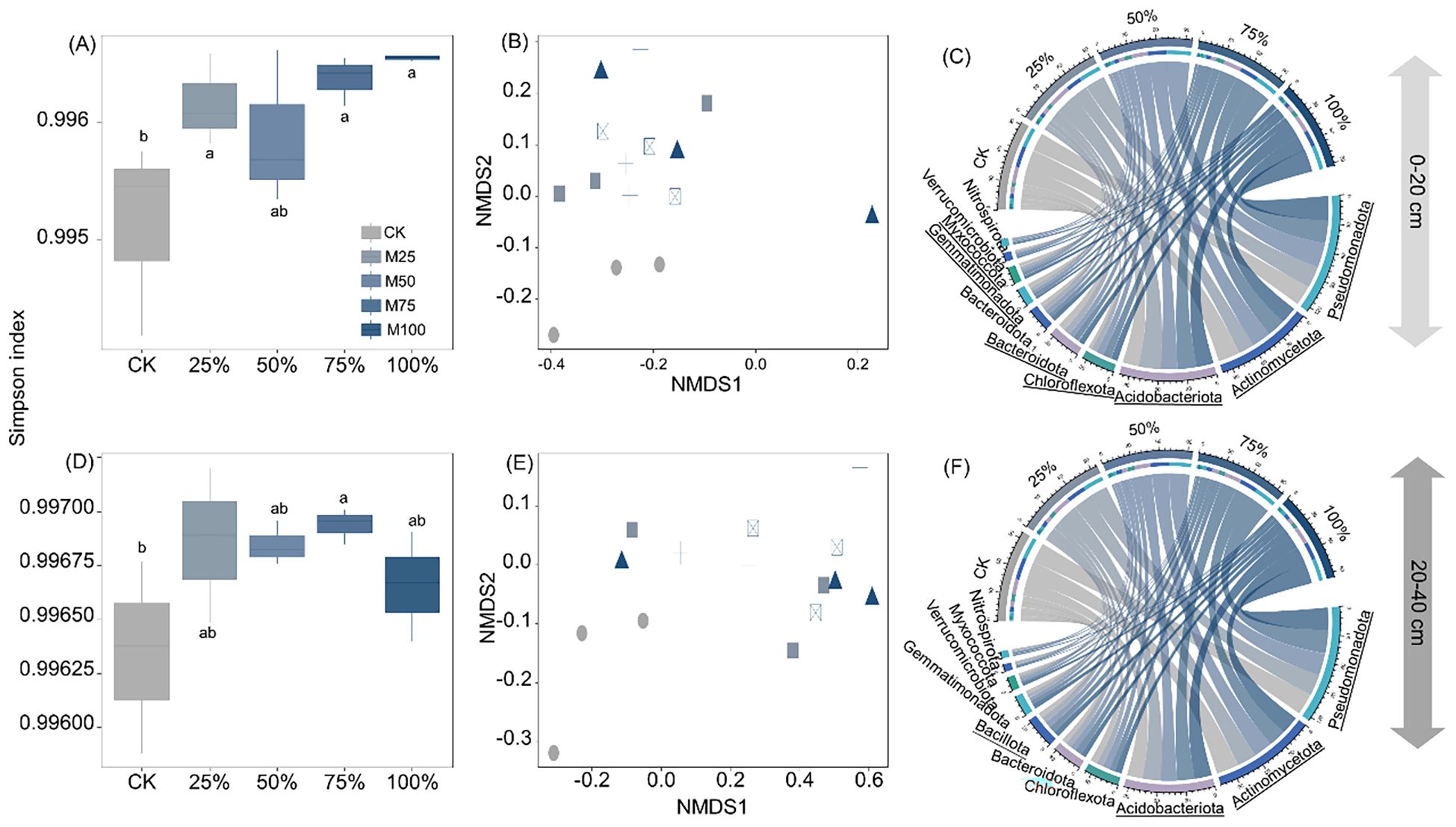 Figure 4. Effects of substituting chemical nitrogen with manure on bacterial diversity and community composition at depths of 0–20 (A–C) and 20–40 cm (D–F). CK, 0% manure N substituted; 25%, 25% manure N substituted; 50%, 50% manure N substituted; 75%, 75% manure N substituted; 100%, 100% manure N substituted. Different letters and underlined notations denote significant differences among treatments at 0.05 level.