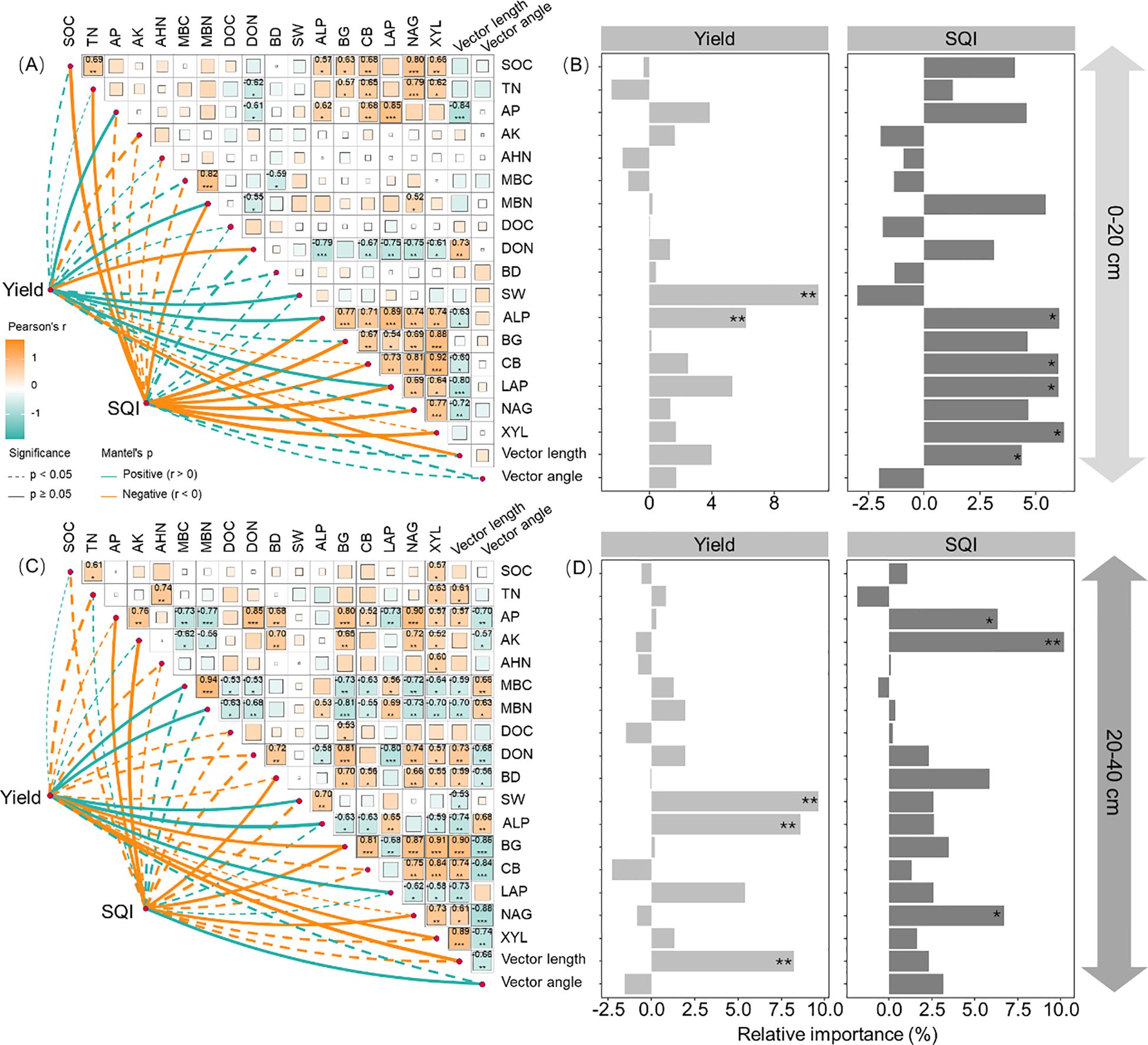 Four-panel figure depicting correlations between soil properties and yield or soil quality index (SQI) at different depths. Panels A and C show correlation matrices with color gradients representing Pearson's r values and significance indicated by dashed lines. Panels B and D display bar graphs of the relative importance of soil properties for yield and SQI, with significance marked by asterisks. Depths are noted as zero to twenty centimeters and twenty to forty centimeters. Vector length and angle annotations are included.