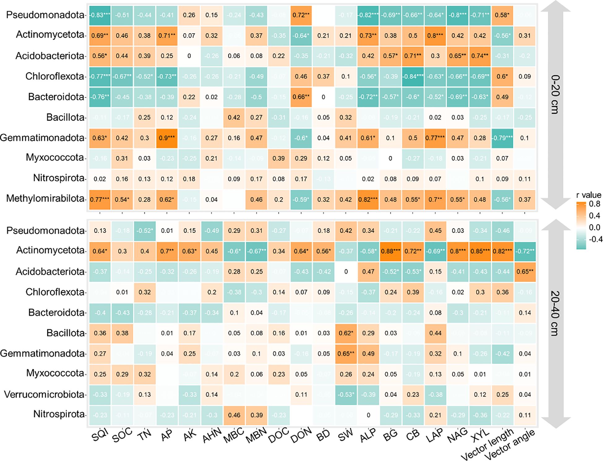 Figure 6. Correlations between the top 10 abundance of bacterial phyla and soil physicochemical properties, enzyme activities, vector length, and angle at depths of 0–20 and 20–40 cm. SQI, soil quality index; SOC, soil organic C; TN, total nitrogen; AP, available phosphorus; AK, available potassium; AHN, alkaline hydrolyzed N; MBC, microbial biomass C; MBN, microbial biomass N; DOC, dissolved organic C; DON, dissolved organic N; BD, bulk density; SW, soil water content; BG, β-1,4-glucosidase; XYL, β-d-xylopyranoside; CB, β-d-cellobiosidase; NAG, β-1,4-N-acetylglucosaminidase; LAP, l-leucine aminopeptidase; ALP, acid phosphatase. ***p < 0.001; ** p < 0.01; *p < 0.05.