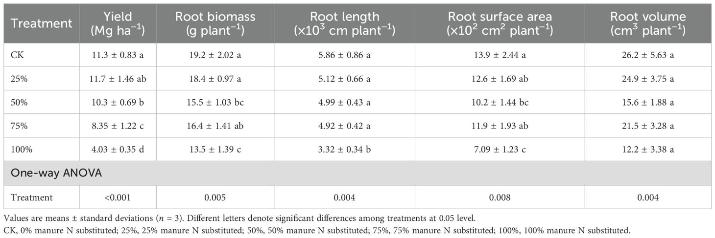Compared to CK, only 25% manure substitution maintained maize yield, while 50%–100% substitution ratios significantly reduced maize yields by 15.9%–67.2% (Table 2; p < 0.05). Moreover, manure substitution treatments decreased root biomass, root length, root surface area, and volume by 13.5%–29.1%, 14.8%–43.3%, 14.1%–48.8%, and 17.9%–53.4% respectively (Table 2; p < 0.05).