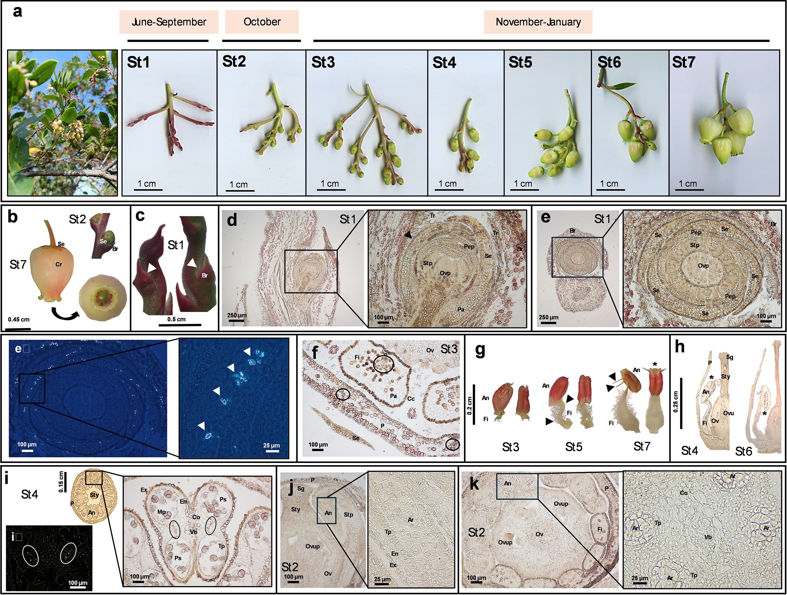 Composite image displaying the development stages of a plant. Panel (a) shows the progression of the flowering from June to January across stages St1 to St7, with scale bars indicating size. Panel (b)  shows mature flower, while panel (c) flower buds. Panel (d) depicts cross-sections showing internal anatomy at St1. Panel (e) presents magnified tissue fluorescence at St1. Panel (f) shows vascular structures at St3. Panel (g) compares anther and filament growth at stages St3, St5, and St7. Panel (h) examines style and anther anatomy at stages St4 and St6. Panel (i) details male reproduction structures at St4. Panel (j) shows anatomical features at St2. Panel (k) presents detailed cell structures at St2.