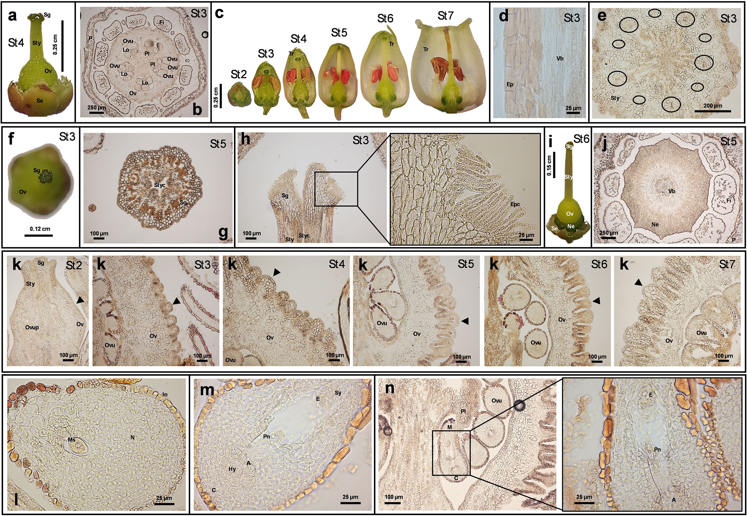 Composite scientific image showing flowers at various stages and relative sections. Panels from a to i depict different developmental stages labelled St2 to St7, highlighting structures like the ovule (Ovu), stigma (Sg), style (Sty), and nectary (Ne). Panels from j to n focus on microscopic views, displaying cellular details of vascular bundles (Vb), epidermis (Ep), ovary,  (Ov), and ovules (Ovu). Each image includes measurement scales and annotations for clarity.