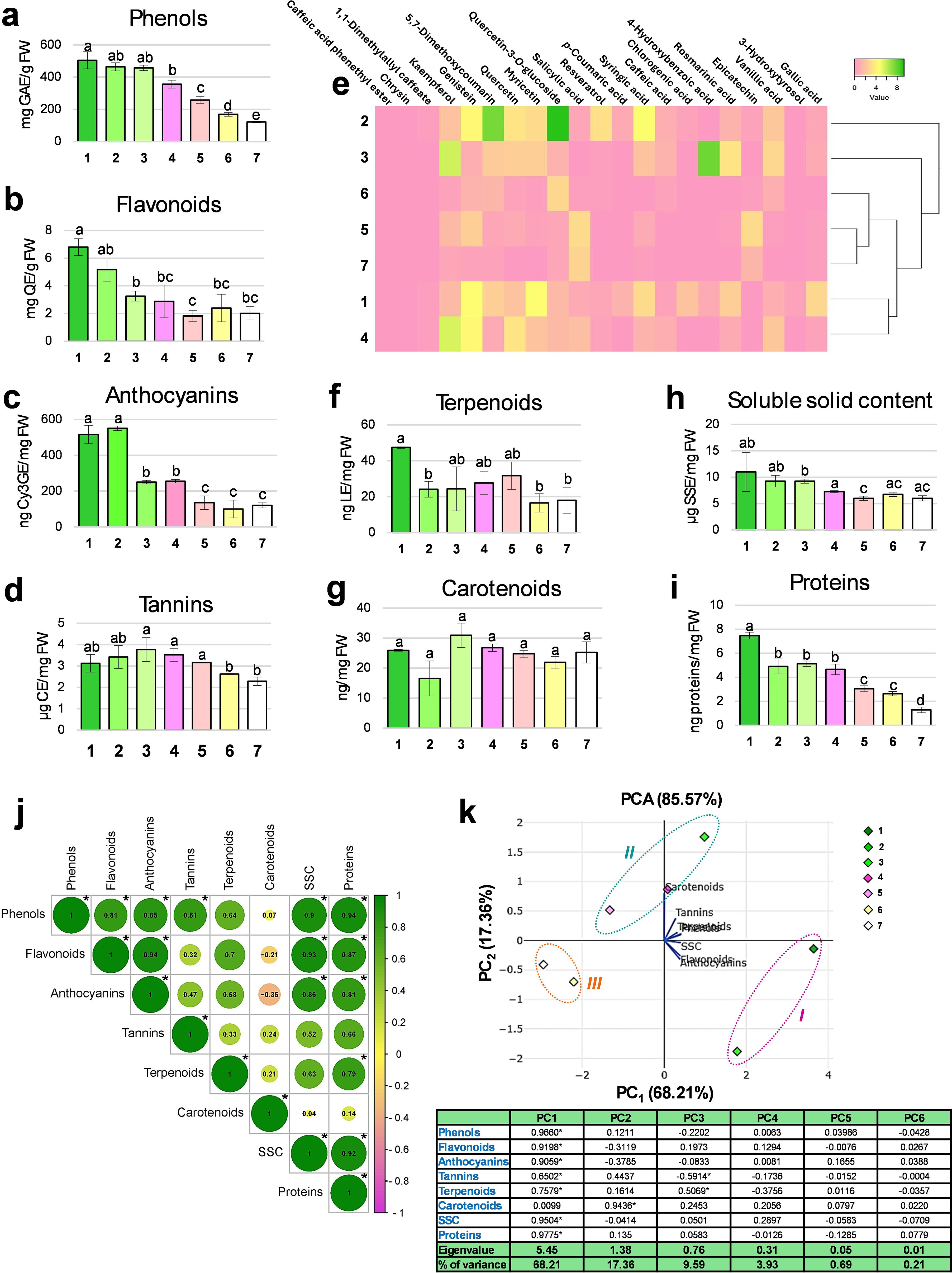 Figure 3. Biochemical analyses of Arbutus unedo flower. Histograms showing the total content in phenols (a), flavonoids (b), anthocyanins (c), tannins (d), terpenoids (f), carotenoids (g), soluble solid content (h) and proteins (i) measured by spectrophotometric assays at each flower stage (from 1 to 7) are reported. For each graph, the unit of measure is indicated on the y-axis. Results are reported as mean values ± standard error. Different letters indicate significant changes among the samples (p<0.05). Metabolomic data obtained by HPLC-DAD are shown in the form of a heatmap (e), where analytes are reported in column and flower stages in row. Minimum and maximum values are set as pink and green, respectively. The hierarchical clustering based on the biochemical profiles of the samples is also visualized. Results of Pearson’s correlation analysis carried out among the investigated biochemical variables (j): the correlation value is indicated inside each circle and asterisks indicate statistically significant correlations (p<0.05). Scatter plot derived from Principal Component Analysis (PCA) based on the studied biochemical traits; three clusters are detectable (I, early stages; II, intermediate stages; III, late stages). Correlation coefficients measured for the different variables (loadings) in each analysis (principal component, PC) are shown in the table reported below the graph, together with the respective Eigenvalue and % of variance (asterisks indicate significant values, p<0.05) (k).