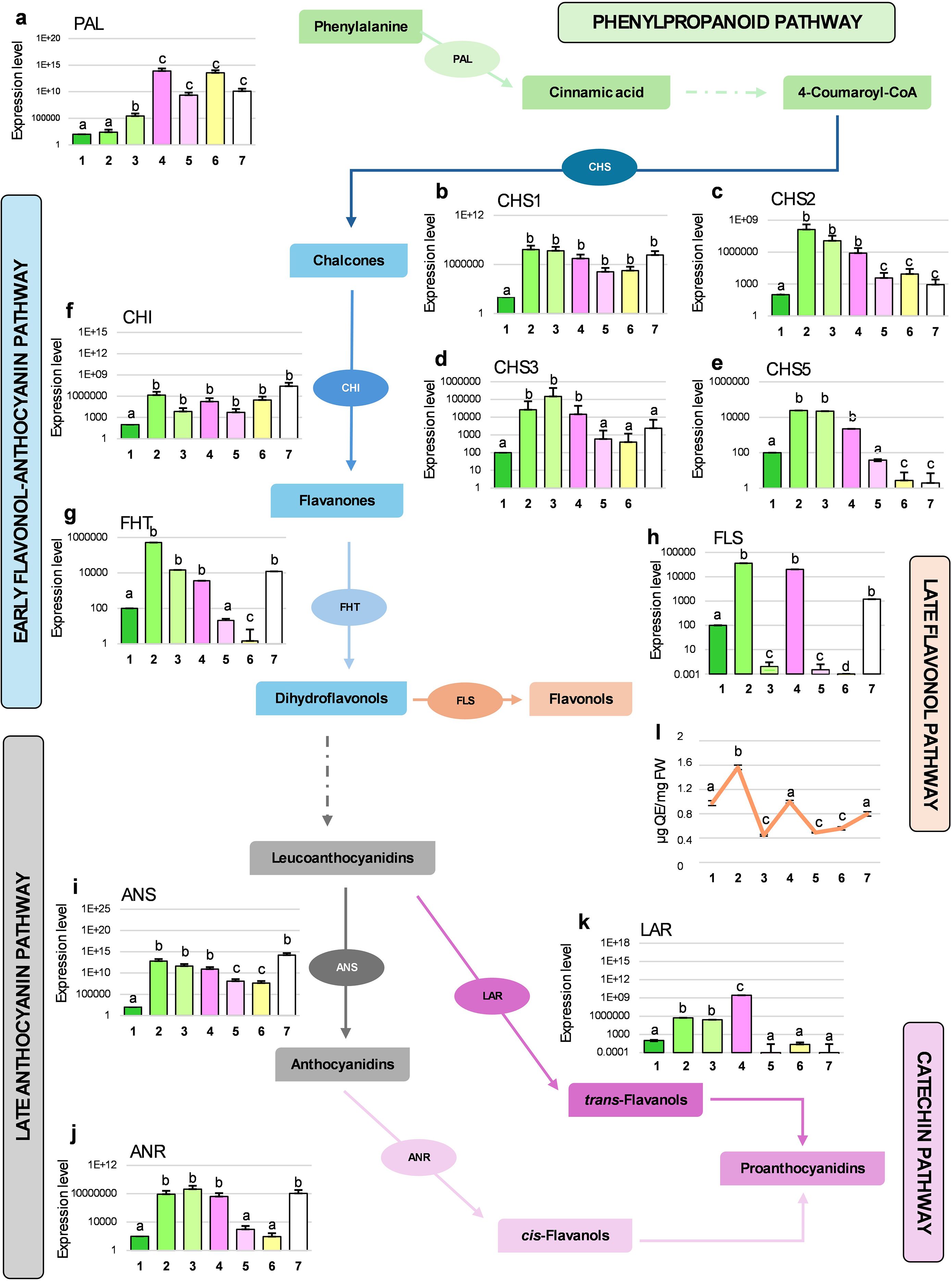 Figure 4. qPCR analyses of the expression levels for 11 genes involved in the biosynthetic pathway of phenylpropanoids and flavonoids (schematically drawn by reporting enzymes and relative products; dotted arrows indicate the presence of intermediate steps not shown) in A. unedo flower samples (from stage 1 to 7). mRNA levels in the various samples were normalized with respect to β-Actin transcript content and compared to the Stage 1 (considered as unit, 100). Results are shown as mean values ± standard error and different letters indicate significant changes among the samples (p<0.05). In panel l, the total content of flavonols is reported (here the unit of measure is indicated on the y-axis). Legend: PAL, Phenylalanine ammonia-Lyase (a); CHS1, Chalcone synthase 1 (b); CHS2, Chalcone synthase 2 (c); CHS3, Chalcone synthase 3 (d); CHS5, Chalcone synthase 5 (e); CHI, Chalcone isomerase (f); FHT, Flavanone 3-β-hydroxylase (g); FLS, Flavonol synthase (h); ANS, Anthocyanidin synthase (i); ANR, Anthocyanidin reductase (j); LAR, Leucoanthocyanidin reductase (k).