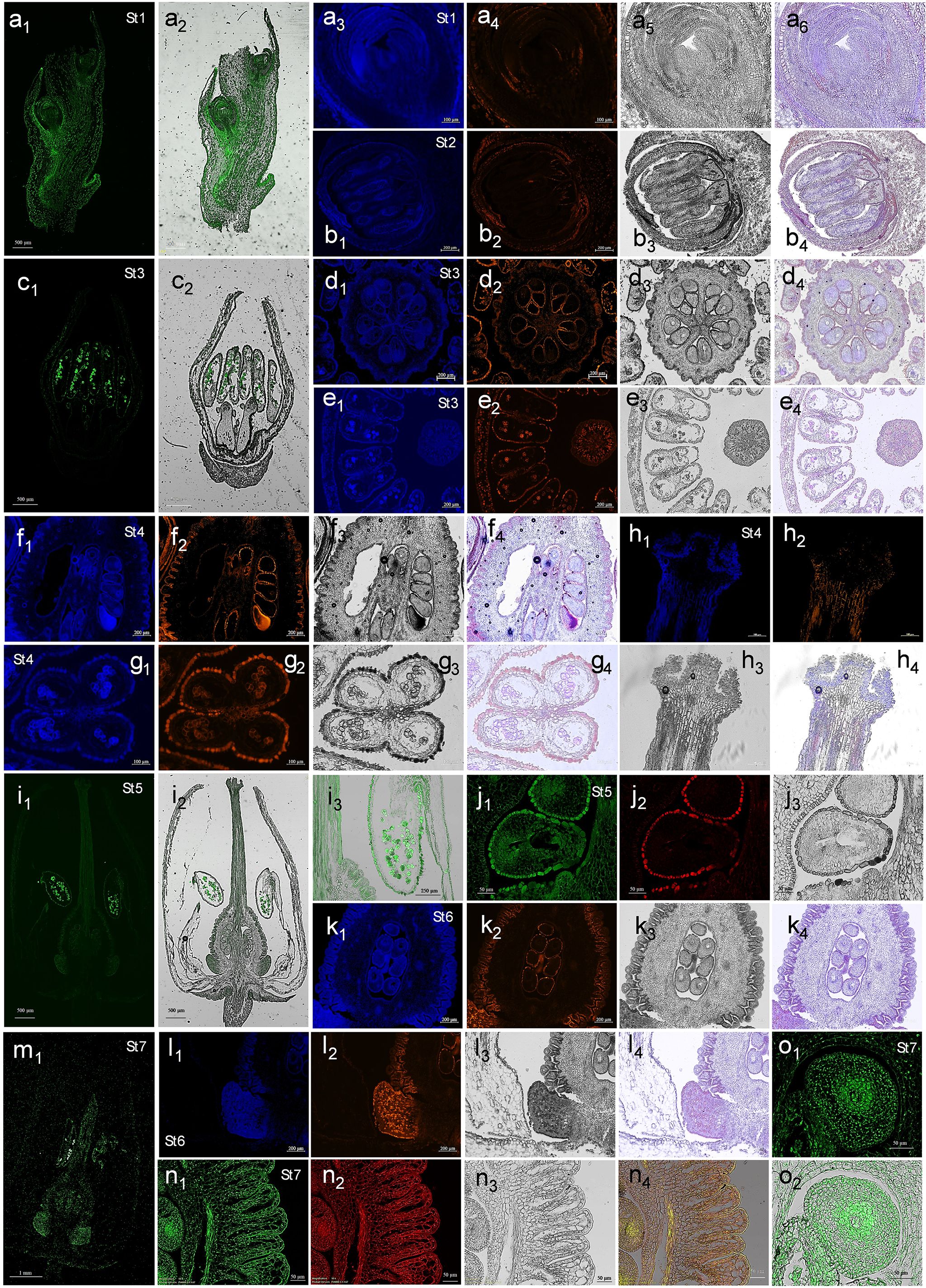 Figure 5. Histochemical localization of flavonols in Arbutus unedo samples. Representative images of histological sections at different developmental stages observed by fluorescence microscopy after DPBA staining. Kaempferol (K)-DPBA and quercetin (Q)-DPBA complexes were discriminated collecting fluorescence at different emission ranges, as reported in method section. (Series of panels a) Samples from St1. K-DPBA visualization in the longitudinal section of a flower bulge included into a bract (a1) and its merging with bright field (a2). Detail of a flower bud in longitudinal section: (a3), K-DPBA; (a4), Q-DPBA; (a5), bright field; and (a6), merged channels. (Series of panels b) Samples from St2. Detail of a flower bud in transversal section: (b1), K-DPBA; (b2), Q-DPBA; (b3), bright field; and (b4), merged channels. (Series of panels c, d and e) Samples from St3. K-DPBA visualization in the longitudinal flower section (c1) and its merging with bright field (c2). Transversal section of ovary: (d1), K-DPBA; (d2), Q-DPBA; (d3), bright field; and (d4), merged channels. Transversal section of anthers (series e): (e1), K-DPBA; (e2), Q-DPBA; (e3), bright field; and (e4), merged channels. (Series of panels f, g and h) Samples from St4. Longitudinal section of ovary (series f): (f1), K-DPBA; (f2), Q-DPBA; (f3), bright field; and (f4), merged channels. Cross section of a single anther (series g): (g1), K-DPBA; (g2), Q-DPBA; (g3), bright field; and (g4), merged channels. Longitudinal section of stigma (series h): (h1), K-DPBA; (h2), Q-DPBA; (h3), bright field; and (h4), merged channels. (Series of panels i and j) Samples from St5. K-DPBA visualization in the longitudinal section of a flower (i1) and its merging with bright field (i2). A magnification of the right anther shown in (i2) panel is also reported (i3). Transversal section of an ovule (series j): (j1), K-DPBA; (j2), Q-DPBA; and (j3), bright field. (Series of panels k and l) Samples from St6. Longitudinal section of ovary (series k): (k1), K-DPBA; (k2), Q-DPBA; (k3), bright field; and (k4), merged channels. Longitudinal section of nectary (series l): (l1), K-DPBA; (l2), Q-DPBA; (l3), bright field; and (l4), merged channels. (Series of panels m, n and o) Samples from St7. K-DPBA visualization in the longitudinal section of a flower (m1). Longitudinal section of ovary (series n): (n1), K-DPBA; (n2), Q-DPBA; (n3), bright field; and (n4), merged channels. K-DPBA visualization in the longitudinal section of ovule (o1) and its merging with bright field (o2). The dimension bar is reported for each panel.