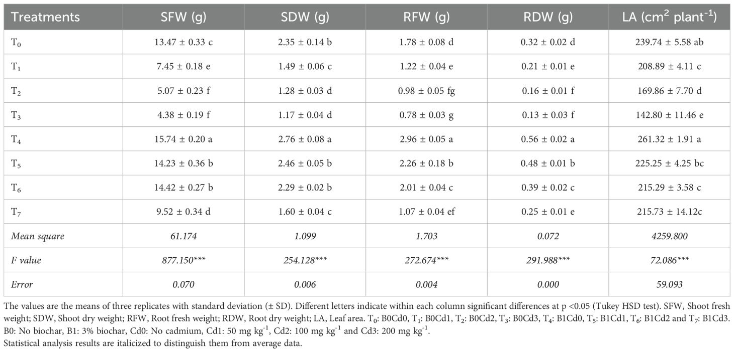 The findings of the study pointed out that the increasing Cd levels had a negative impact on the growth characteristics of soybean seedlings under normal conditions (Table 1). Compared to the T0 treatment, the T1, T2, and T3 treatments resulted in 45, 62 and 67% decrease in SFW, 37, 46 and 50% decrease in SDW, 31, 45 and 56% in RFW, 34, 50 and 59% in RDW, and 13, 29 and 40% decrease in LA. The negative effects of Cd on soybean growth parameters were generally mitigated by the biochar used in the study (Table 1).