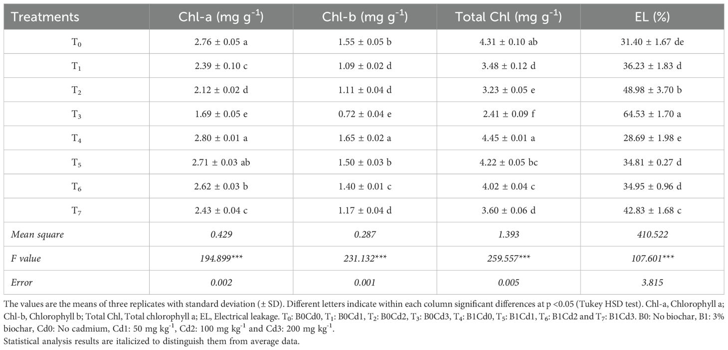 Table 2. Effect of hazelnut shell biochar on chlorophyll content and electrical leakage of forage soybean in Cd-contaminated soils (***: p<0.001).